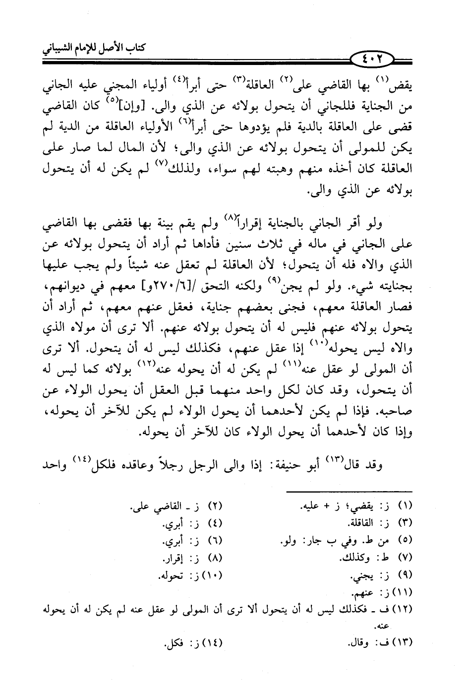 ولو أقر الجاني بالجناية إقراراً (¬8) ولم يقم بينة بها فقضى بها القاضي على الجاني في ماله في ثلاث سنين فأداها ثم أراد أن يتحول بولائه عن الذي والاه فله أن يتحول؛ لأن العاقلة لم تعقل عنه شيئاً ولم يجب عليها بجنايته شيء. ولو لم يجن (¬9) ولكنه التحق معهم في ديوانهم، فصار العاقلة معهم، فجنى بعضهم جناية، فعقل عنهم معهم، ثم أراد أن يتحول بولائه عنهبم فليس له أن يتحول بولائه عنهم. ألا ترى أن مولاه الذي والاه ليس يحوله (¬10) إذا عقل عنهم، فكذلك ليس له أن يتحول. ألا ترى أن المولى لو عقل عنه (¬11) لم يكن له أن يحوله عنه (¬12) بولائه كما ليس له أن يتحول، وقد كان لكل واحد منهما قبل العقل أن يحول الولاء عن صاحبه. فإذا لم يكن لأحدهما أن يحول الولاء لم يكن للآخر أن يحوله، وإذا كان لأحدهما أن يحول الولاء كان للآخر أن يحوله.