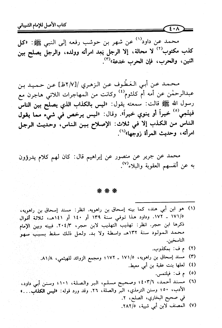 (¬6) مسند أحمد، 6/ 403؛ وصحيح مسلم، البر والصلة، 101؛ وسنن أبي داود، الأدب، 50؛ وسنن الترمذي، البر والصلة، 26. وقد ورد قوله: "ليس الكذاب. . ." في صحيح البخاري، الصلح، 2.