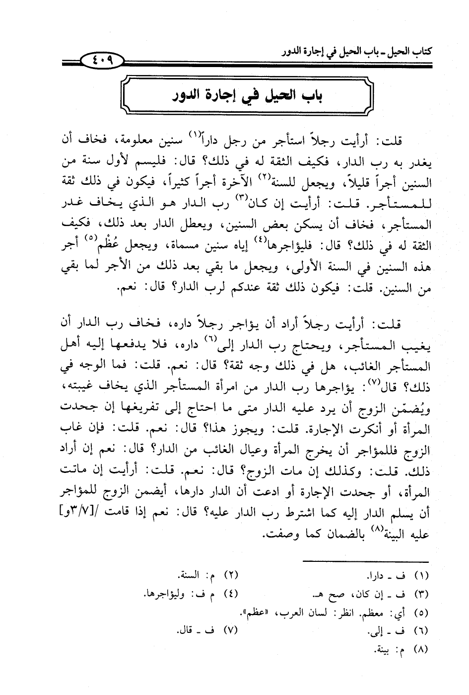 قلت: أرأيت رجلاً أراد أن يؤاجر رجلاً داره، فخاف رب الدار أن يغيب المستأجر، ويحتاج رب الدار إلى (¬6) داره، فلا يدفعها إليه أهل المستأجر الغائب، هل في ذلك وجه ثقة؟ قال: نعم. قلت: فما الوجه في ذلك؟ قال (¬7): يؤاجرها رب الدار مين امرأة المستأجر الذي يخاف غيبته، ويُضمّن الزوج أن يرد عليه الدار متى ما احتاج إلى تفريغها إن جحدت المرأة أو أنكرت الإجارة. قلت: ويجوز هذا؟ قال: نعم. قلت: فإن غاب الزوج فللمؤاجر أن يخرج المرأة وعيال الغائب من الدار؟ قال؛ نعم إن أراد ذلك. قلت: وكذلك إن مات الزوج؟ قال: نعم. قلت: أرأيت إن ماتت المرأة، أو جحدت الإجارة أو ادعت أن الدار دارها، أيضمن الزوج للمؤاجر أن يسلم الدار إليه كما اشترط رب الدار عليه؟ قال: نعم إذا قامت عليه البينة (¬8) بالضمان كما وصفت.