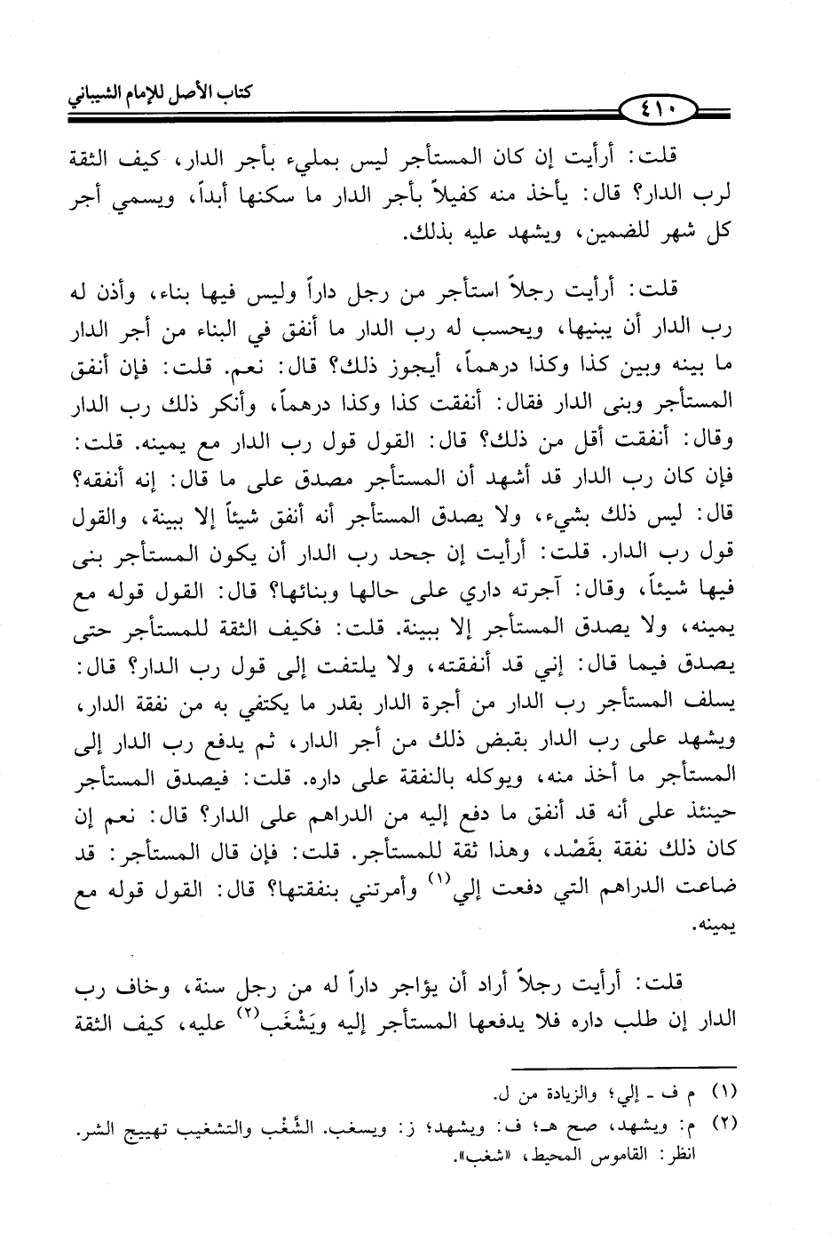 قلت: أرأيت إن كان المستأجر ليس بمليء بأجر الدار، كيف الثقة لرب الدار؟ قال: يأخذ منه كفيلاً بأجر الدار ما سكنها أبداً، ويسمي أجر كل شهر للضمين، ويشهد عليه بذلك.