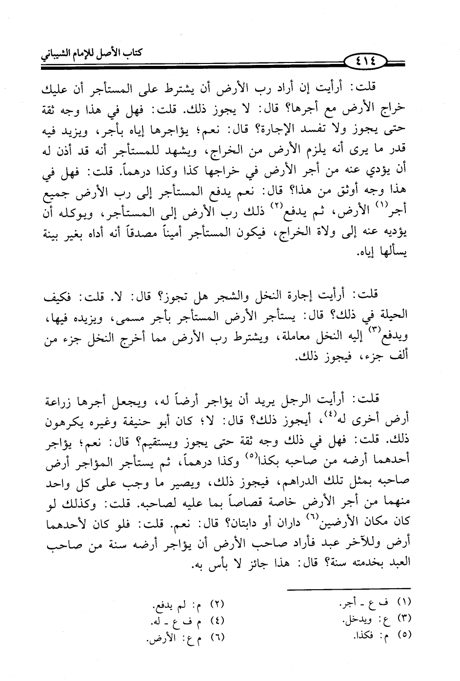 قلت: أرأيت الرجل يريد أن يؤاجر أرضاً له، ويجعل أجرها زراعة أرض أخرى له (¬4)، أيجوز ذلك؟ قال: لا؛ كان أبو حنيفة وغيره يكرهون ذلك. قلت: فهل في ذلك وجه ثقة حتى يجوز ويستقيم؟ قال: نعم؛ يؤاجر أحدهما أرضه من صاحبه بكذا (¬5) وكذا درهماً، ثم يستأجر المؤاجر أرض صاحبه بمثل تلك الدراهم، فيجوز ذلك، ويصير ما وجب على كل واحد منهما من أجر الأرض خاصة قصاصاً بما عليه لصاحبه. قلت: وكذلك لو كان مكان الأرضين (¬6) داران أو دابتان؟ قال: نعم. قلت: فلو كان لأحدهما أرض وللآخر عبد فأراد صاحب الأرض أن يؤاجر أرضه سنة من صاحب العبد بخدمته سنة؟ قال: هذا جائز لا بأس به.