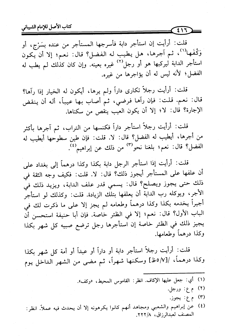 قلت: أرأيت إذا استأجر الرجل دابة بكذا وكذا درهماً إلى بغداد على أن علفها على المستأجر أيجوز ذلك؟ قال: لا. قلت: فكيف وجه الثقة في ذلك حتى يجوز ويصلح؟ قال: يسمي قدر علف الدابة، ويزيد ذلك في الأجر، ويوكله رب الدابة أن يعلفها بتلك الزيادة. قلت: وكذلك لو استأجر أجيراً يخدمه بكذا وكذا درهماً وطعامه لم يجز إلا على ما ذكرت لك في الباب الأول؟ قال: نعم؛ إلا في الظئر خاصة. فإن أبا حنيفة استحسن أن يجبز ذلك في الظئر خاصة إن استأجرها رجل ترضع صبيه كل شهر بكذا وكذا درهماً وطعامها.