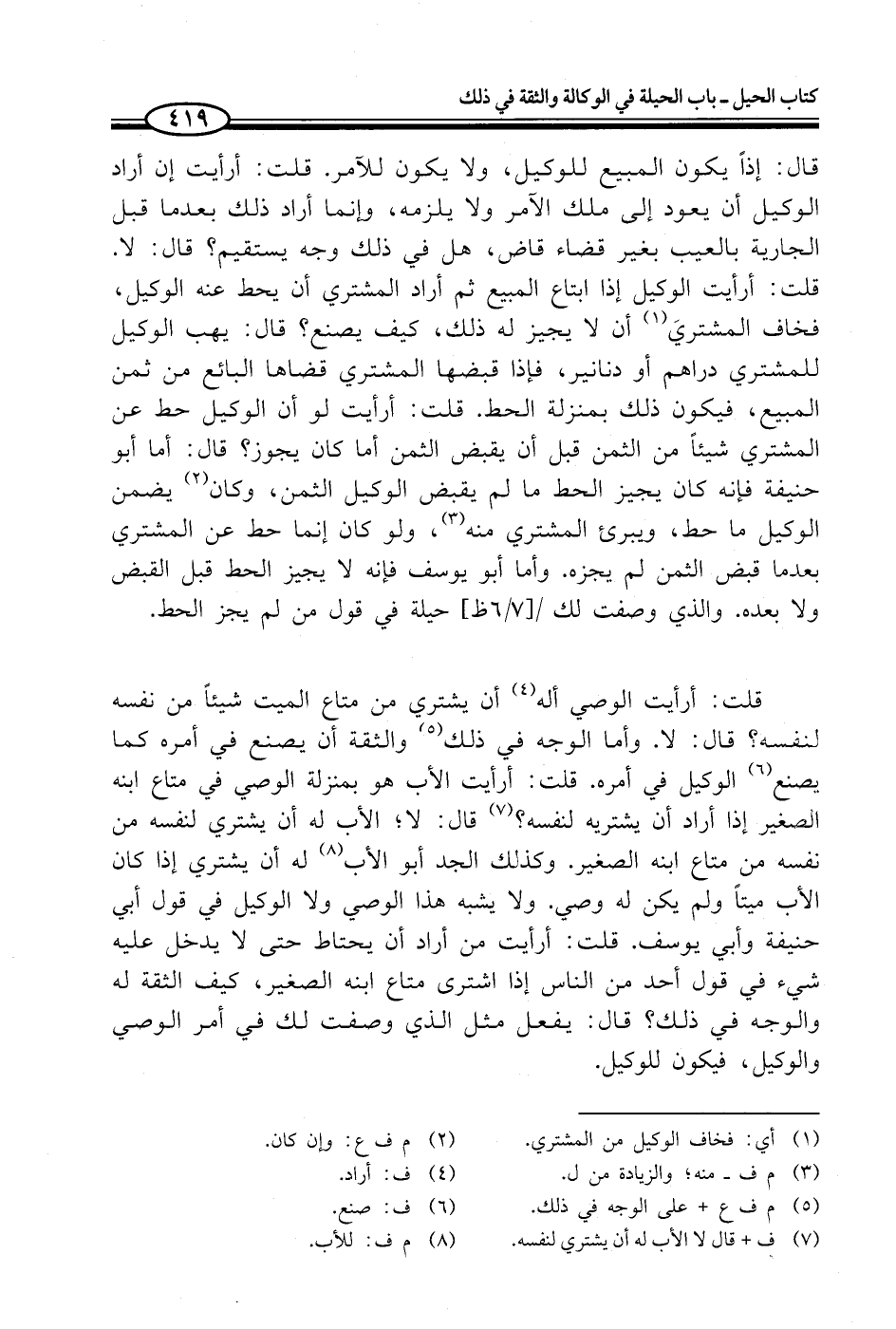 قال: إذاً يكون المبيع للوكيل، ولا يكون للآمر. قلت: أرأيت إن أراد الوكيل أن يعود إلى ملك الآمر ولا يلزمه، وإنما أراد ذلك بعدما قبل الجارية بالعيب بغير قضاء قاض، هل في ذلك وجه يستقيم؟ قال: لا. قلت: أرأيت الوكيل إذا ابتاع المبيع ثم أراد المشتري أن يحط عنه الوكيل، فخاف المشتريَ (¬1) أن لا يجيز له ذلك، كيف يصنع؟ قال: يهب الوكيل للمشتري دراهم أو دنانير، فإذا قبضها المشتري قضاها البائع من ثمن المبيع، فيكون ذلك بمنزلة الحط. قلت: أرأيت لو أن الوكيل حط عن المشتري شيئاً من الثمن قبل أن يقبض الثمن أما كان يجوز؟ قال: أما أبو حنيفة فإنه كان يجيز الحط ما لم يقبض الوكيل الثمن، وكان (¬2) يضمن الوكيل ما حط، ويبرئ المشتري منه (¬3)، ولو كان إنما حط عن المشتري بعدما قبض الثمن لم يجزه. وأما أبو يوسف فإنه لا يجيز الحط قبل القبض ولا بعده. والذي وصفت لك حيلة في قول من لم يجز الحط.