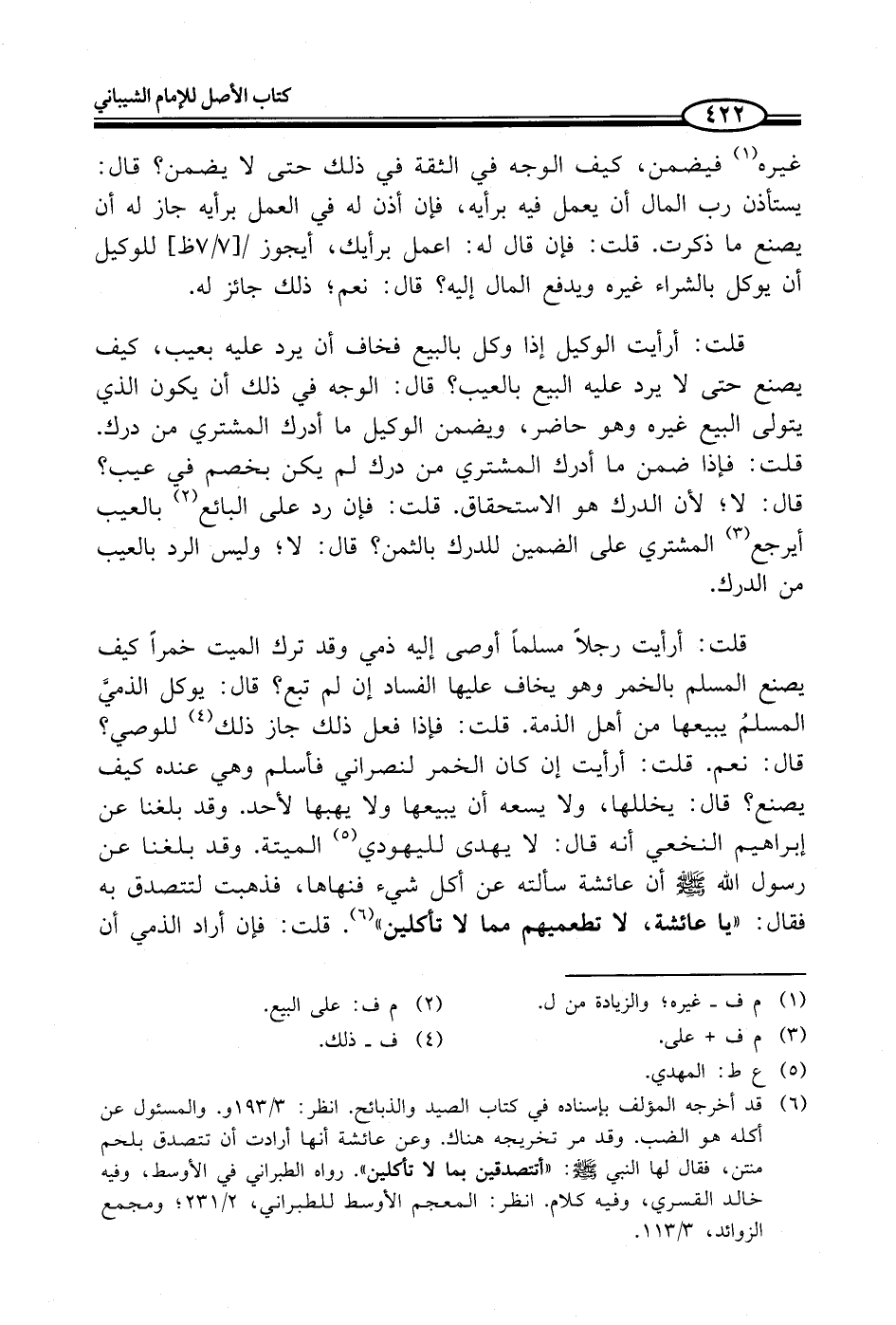 قلت: أرأيت رجلاً مسلماً أوصى إليه ذمي وقد ترك الميت خمراً كيف يصنع المسلم بالخمر وهو يخاف عليها الفساد إن لم تبع؟ قال: يوكل الذميَّ المسلمُ يبيعها من أهل الذمة. قلت: فإذا فعل ذلك جاز ذلك (¬4) للوصي؟ قال: نعم. قلت: أرأيت إن كان الخمر لنصراني فأسلم وهي عنده كيف يصنع؟ قال: يخللها، ولا يسعه أن يبيعها ولا يهبها لأحد. وقد بلغنا عن إبراهيم النخعي أنه قال: لا يهدى لليهودي (¬5) الميتة. وقد بلغنا عن رسول الله - صلى الله عليه وسلم - أن عائشة سألته عن أكل شيء فنهاها، فذهبت لتتصدق به فقال: "يا عائشة، لا تطعميهم مما لا تأكلين" (¬6). قلت: فإن أراد الذمي أن