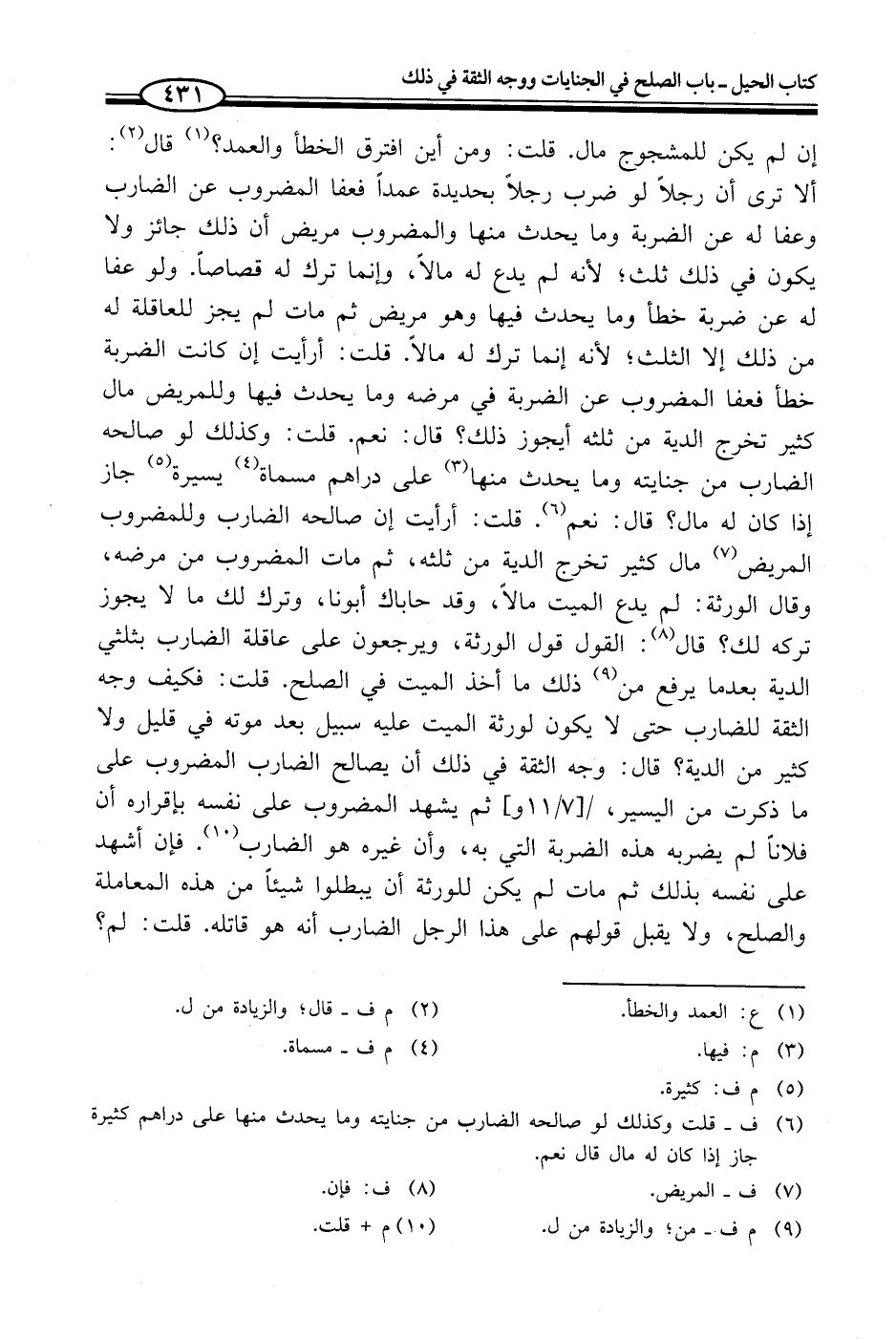 إن لم يكن للمشجوج مال. قلت: ومن أين افترق الخطأ والعمد؟ (¬1) قال (¬2): ألا ترى أن رجلاً لو ضرب رجلاً بحديدة عمداً فعفا المضروب عن الضارب وعفا له عن الضربة وما يحدث منها والمضروب مريض أن ذلك جائز ولا يكون في ذلك ثلث؛ لأنه لم يدع له مالاً، د نما ترك له قصاصأ. ولو عفا له عن ضربة خطأ وما يحدث فيها وهو مريض ثم مات لم يجز للعاقلة له من ذلك إلا الثلث؛ لأنه إنما ترك له مالاً. قلت: أرأيت إن كانت الضربة خطأ فعفا المضروب عن الضربة في مرضه وما يحدث فيها وللمريض مال كثير تخرج الدية من ثلثه أيجوز ذلك؟ قال: نعم. قلت: وكذلك لو صالحه الضارب من جنايته وما يحدث منها (¬3) على دراهم مسماة (¬4) يسيرة (¬5) جاز إذا كان له مال؟ قال: نعم (¬6). قلت: أرأيت إن صالحه الضارب وللمضروب المريض (¬7) مال كثير تخرج الدية من ثلثه، ثم مات المضروب من مرضه، وقال الورثة: لم يدع الميت مالاً، وقد حاباك أبونا، وترك لك ما لا يجوز تركه لك؟ قال (¬8): القول قول الورثة، ويرجعون على عاقلة الضارب بثلثي الدية بعدما يرفع من (¬9) ذلك ما أخذ الميت في الصلح. قلت: فكيف وجه الثقة للضارب حتى لا يكون لورثة الميت عليه سبيل بعد موته في قليل ولا كثير من الدية؟ قال: وجه الثقة في ذلك أن يصالح الضارب المضروب على ما ذكرت من اليسير، ثم يشهد المضروب على نفسه بإقراره أن فلاناً لم يضربه هذه الضربة التي به، وأن غيره هو الضارب (¬10). فإن أشهد على نفسه بذلك ثم مات لم يكن للورثة أن يبطلوا شيئأ من هذه المعاملة والصلح، ولا يقبل قولهم على هذا الرجل الضارب أنه هو قاتله. قلت: لم؟