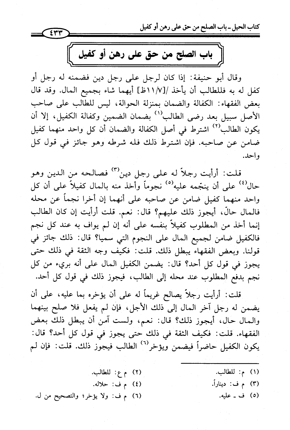 قلت: أرأيت رجلاً له على رجل دين (¬3) فصالحه من الدين وهو حال (¬4) على أن ينجّمه عليه (¬5) نجوماً وأخذ منه بالمال كفيلاً على أن كل واحد منهما كفيل ضامن عن صاحبه على أنهما إن أخرا نجماً عن محله فالمال حالّ، أيجوز ذلك عليهم؟ قال: نعم. قلت أرأيت إن كان الطالب إنما أخذ من المطلوب كفيلاً بنفسه على أنه إن لم يواف به عند كل نجم فالكفيل ضامن لجميع المال على النجوم التي سميا؟ قال: ذلك جائز في قولنا. وبعض الفقهاء يبطل ذلك. قلت: فكيف وجه الثقة في ذلك حتى يجوز في قول كل أحد؟ قال: يضمن الكفيل المال على أنه بريء من كل نجم بدفع المطلوب عند محله إلى الطالب، فيجوز ذلك في قول كل أحد.
