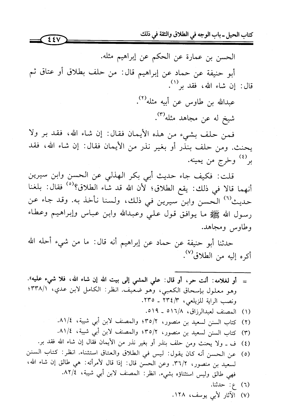 (¬5) عن الحسن أنه كان يقول: ليس في الطلاق والعتاق استثناء. انظر: كتاب السنن لسعيد بن منصور، 2/ 36. وعن الحسن قال: إذا قال لأمرأته: هي طالق إن شاء الله، فهي طالق وليس استثناؤه بشيء. انظر: المصنف لابن أبي شيبة، 4/ 82 ـ