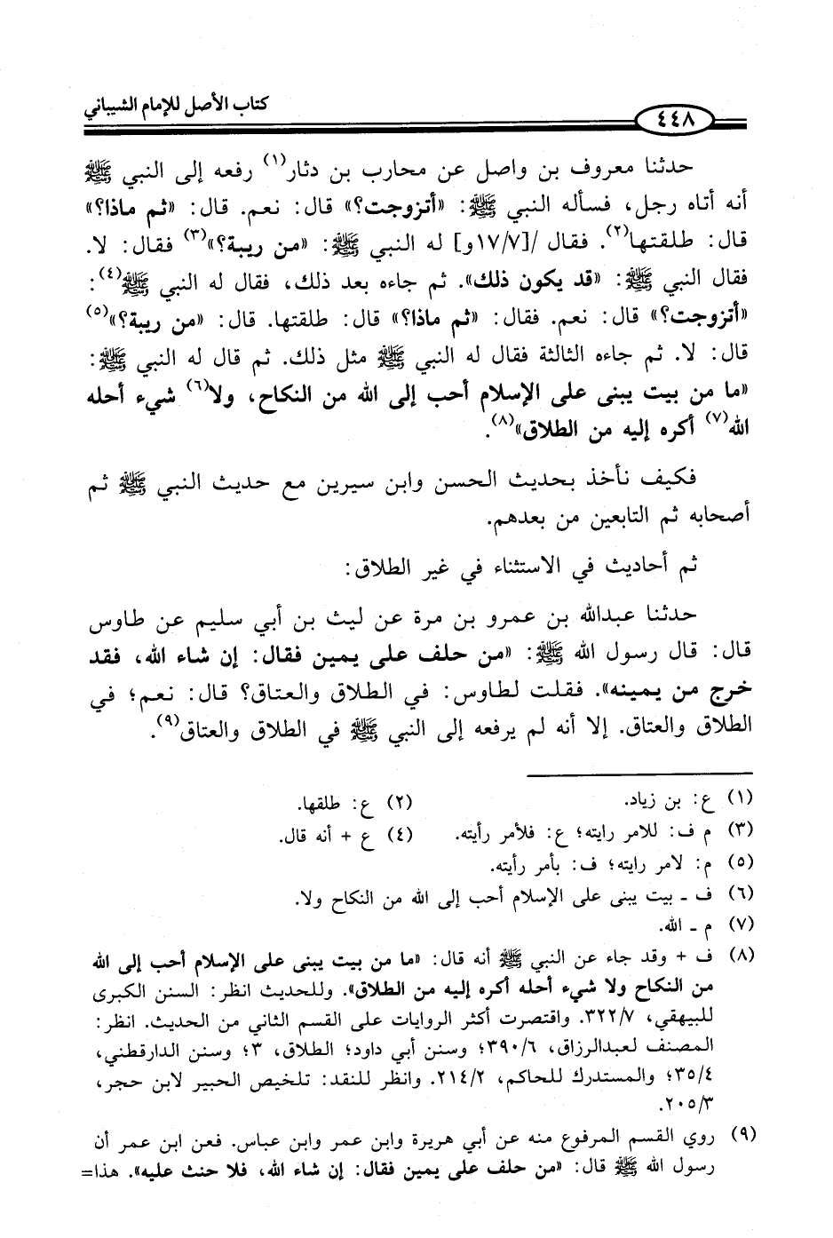 (¬8) ف + وقد جاء عن النبي - صلى الله عليه وسلم - أنه قال: "ما من بيت يبنى على الإسلام أحب الى الله من النكاح ولا شيء أحله أكره اليه من الطلاق". وللحديث انظر: السنن الكبرى للبيهقي، 7/ 322. واقتصرت أكثر الروايات على القسم الثاني من الحديث. انظر: المصنف لعبد الرزاق، 6/ 390؛ وسنن أبي داود؛ الطلاق، 3؛ وسنن الدارقطني، 4/ 35؛ والمستدرك للحاكم، 2/ 214. وانظر للنقد: تلخيص الحبير لابن حجر، 3/ 205.
