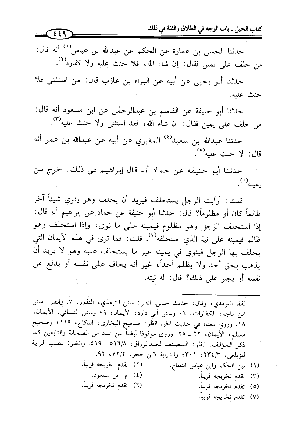 قلت: أرأيت الرجل يستحلف فيريد أن يحلف وهو ينوي شيئاً آخر ظالماً كان أو مظلوماً؟ قال: حدثنا أبو حنيفة عن حماد عن إبراهيم أنه قال: إذا استحلف الرجل وهو مظلوم فيمينه على ما نوى، وإذا استحلف وهو ظالم فيمينه على نية الذي استحلفه (¬7). قلت: فما ترى في هذه الأيمان التي يحلف بها الرجل فينوي في يمينه غير ما يستحلف عليه وهو لا يريد أن يذهب بحق أحد ولا يظلم أحداً، غير أنه يخاف على نفسه أو يدفع عن نفسه أو يجبر على ذلك؟ قال: له نيته.