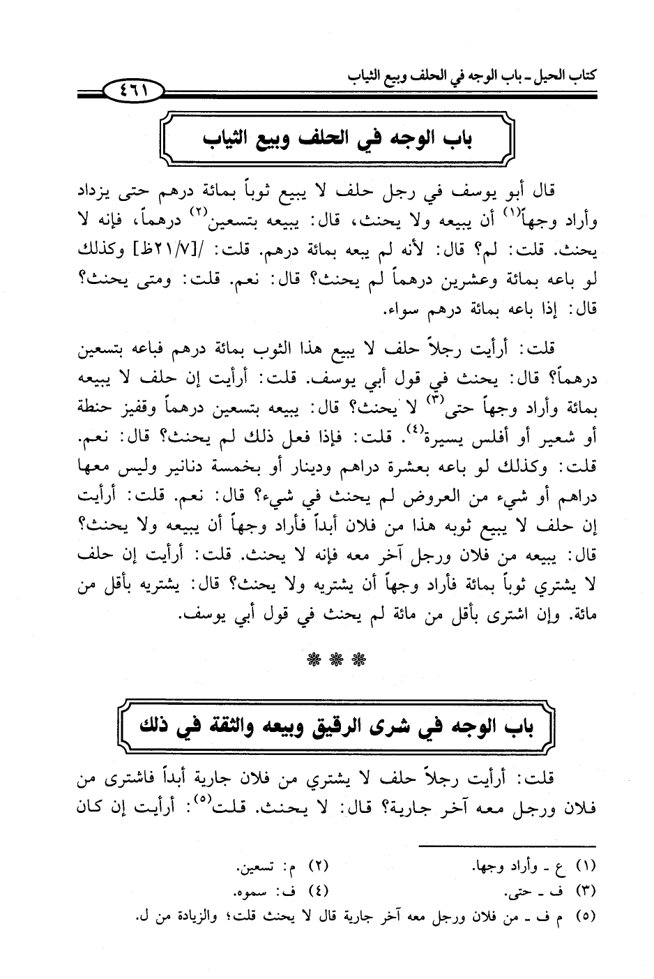 قلت: أرأيت رجلاً حلف لا يبيع هذا الثوب بمائة درهم فباعه بتسعين درهماً؟ قال: يحنث في قول أبي يوسف. قلت: أرأيت إن حلف لا يبيعه بمائة وأراد وجهاً حتى (¬3) لا. يحنث؟ قال: يبيعه بتسعين درهماً وقفيز حنطة أو شعير أو أفلس يسيرة (¬4). قلت: فإذا فعل ذلك لم يحنث؟ قال: نعم. قلت: وكذلك لو باعه بعشرة دراهم ودينار أو بخمسة دنانير وليس معها دراهم أو شيء من العروض لم يحنث في شيء؟ قال: نعم. قلت: أرأيت إن حلف لا يبيع ثوبه هذا من فلان أبداً فأراد وجهاً أن يبيعه ولا يحنث؟ قال: يبيعه من فلان ورجل آخر معه فإنه لا يحنث. قلت: أرأيت إن حلف لا يشتري ثوباً بمائة فأراد وجهاً أن يشتريه ولا يحنث؟ قال: يشتريه بأقل من مائة. وإن اشترى بأقل من مائة لم يحنث في قول أبي يوسف.