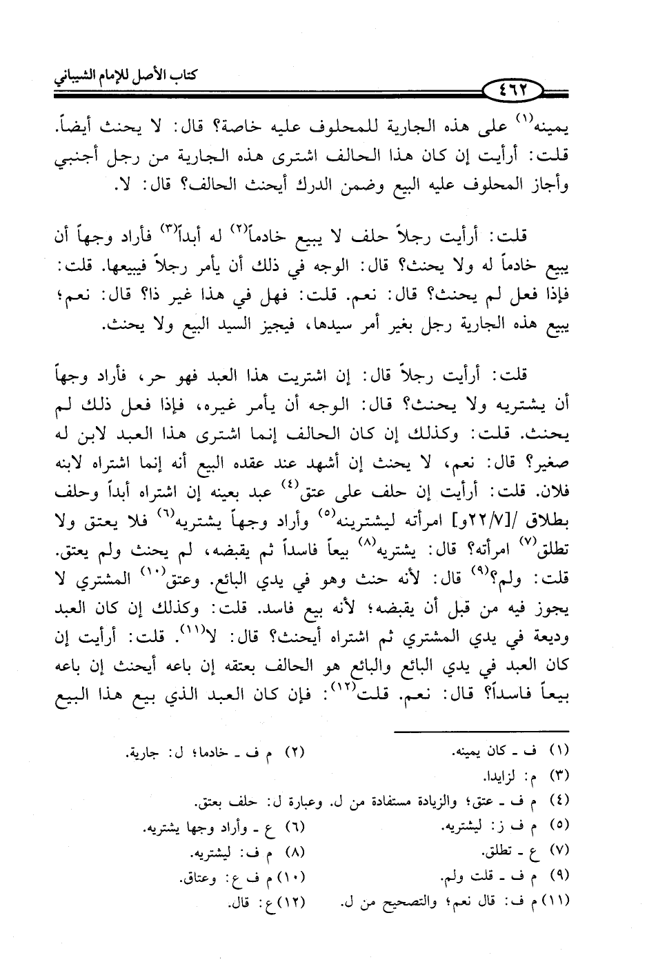 قلت: أرأيت رجلاً قال: إن اشتريت هذا العبد فهو حر، فأراد وجهاً أن يشتريه ولا يحنث؟ قال: الوجه أن يأمر غيره، فإذا فعل ذلك لم يحنث. قلت: وكذلك إن كان الحالف إنما اشترى هذا العبد لابن له صغير؟ قال: نعم، لا يحنث إن أشهد عند عقده البيع أنه إنما اشتراه لابنه فلان. قلت: أرأيت إن حلف على عتق (¬4) عبد بعينه إن اشتراه أبداً وحلف بطلاق امرأته ليشترينه (¬5) وأراد وجهاً يشتريه (¬6) فلا يعتق ولا تطلق (¬7) امرأته؟ قال: يشتريه (¬8) بيعاً فاسداً ثم يقبضه، لم يحنث ولم يعتق. قلت: ولم؟ (¬9) قال: لأنه حنث وهو في يدي البائع. وعتق (¬10) المشتري لا يجوز فيه من قبل أن يقبضه؛ لأنه بيع فاسد. قلت: وكذلك إن كان العبد وديعة في يدي المشتري ثم اشتراه أيحنث؟ قال: لا (¬11). قلت: أرأيت إن كان العبد في يدي البائع والبائع هو الحالف بعتقه إن باعه أيحنث إن باعه بيعاً فاسداً؟ قال: نعم. قلت (¬12): فإن كان العبد الذي بيع هذا البيع