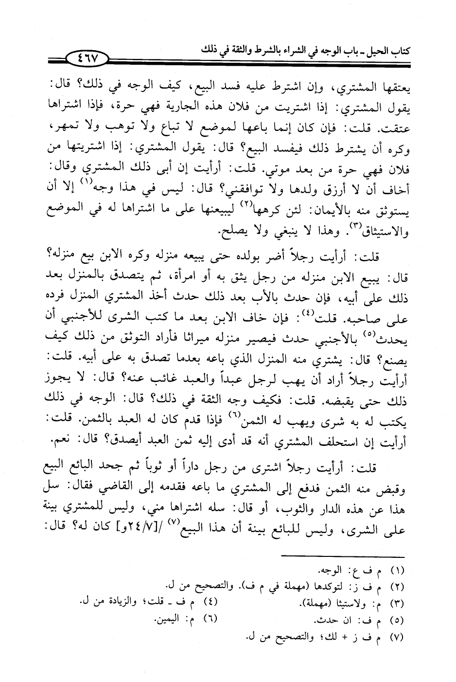 قلت: أرأيت رجلاً أضر بولده حتى يبيعه منزله وكره الابن بيع منزله؟ قال: يبيع الابن منزله من رجل يثق به أو امرأة، ثم يتصدق بالمنزل بعد ذلك على أبيه، فإن حدث بالأب بعد ذلك حدث أخذ المشتري المنزل فرده على صاحبه. قلت (¬4): فإن خاف الابن بعد ما كتب الشرى للأجنبي أن يحدث (¬5) بالأجنبي حدث فيصير منزله ميراثا فأراد التوثق من ذلك كيف يصنع؟ قال: يشتري منه المنزل الذي باعه بعدما تصدق به على أبيه. قلت: أرأيت رجلاً أراد أن يهب لرجل عبداً والعبد غائب عنه؟ قال: لا يجوز ذلك حتى يقبضه. قلت: فكيف وجه الثقة في ذلك؟ قال: الوجه في ذلك يكتب له به شرى ويهب له الثمن (¬6) فإذا قدم كان له العبد بالثمن. قلت: أرأيت إن استحلف المشتري أنه قد أدى إليه ثمن العبد أيصدق؟ قال: نعم.