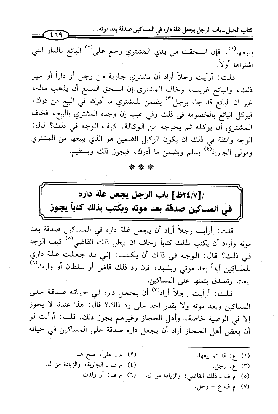 قلت: أرأيت رجلاً أراد (¬7) أن يجعل داره في حياته صدقة على المساكين وبعد موته ولا يقدر أحد على رد ذلك؟ قال: هذا عندنا لا يجوز إلا في الوصية خاصة، وأهل الحجاز وغيرهم يجوّز ذلك. قلت: أرأيت لو أن بعض أهل الحجاز أراد أن يجعل داره صدقة على المساكين في حياته