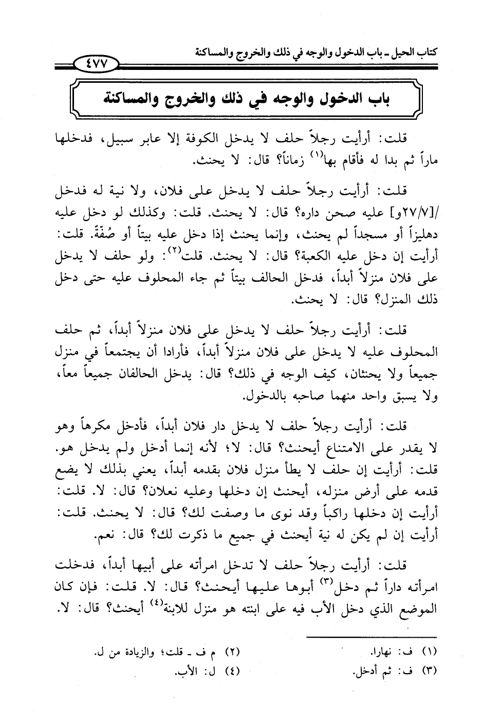 قلت: أرأيت رجلاً حلف لا تدخل امرأته على أبيها أبداً، فدخلت امرأته دأراً ثم دخل (¬3) أبوها عليها أيحنث؟ قال: لا. قلت: فإن كان الموضع الذي دخل الأب فيه على ابنته هو منزل للابنة (¬4) أيحنث؟ قال: لا.