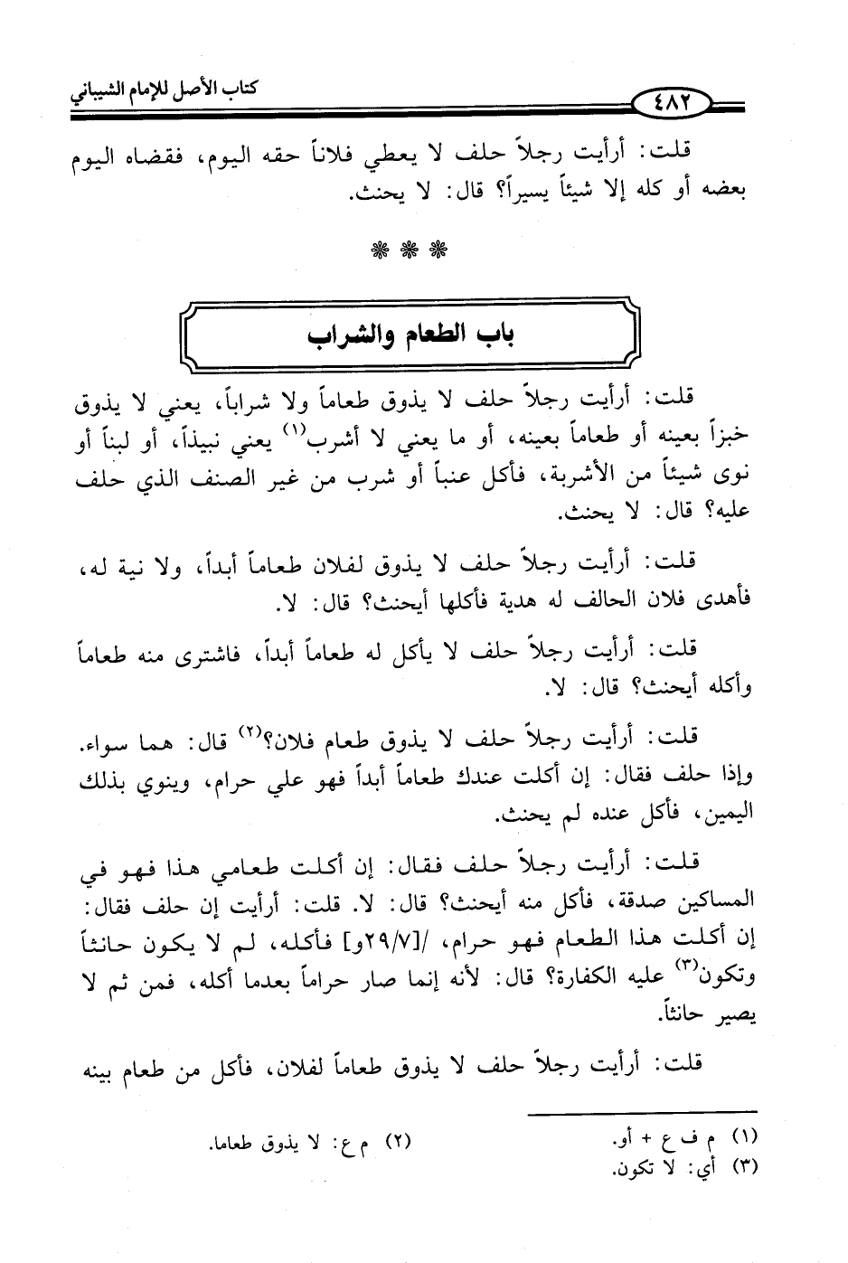 قلت: أرأيت رجلاً حلف لا يذوق طعاماً ولا شراباً، يعني لا يذوق خبزاً بعينه أو طعاماً بعينه، أو ما يعني لا أشرب (¬1) يعني نبيذاً، أو لبناً أو نوى شيئاً من الأشربة، فأكل عنباً أو شرب من غير الصنف الذى حلف عليه؟ قال: لايحنث.