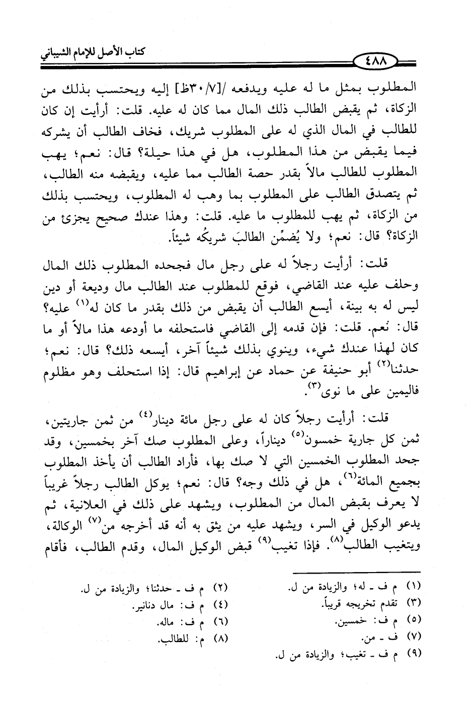 المطلوب بمثل ما له عليه ويدفعه إليه ويحتسب بذلك من الزكاة، ثم يقبض الطالب ذلك المال مما كان له عليه. قلت: أرأيت إن كان للطالب في المال الذي له على المطلوب شريك، فخاف الطالب أن يشركه فيما يقبض من هذا المطلوب، هل في هذا حيلة؟ قال: نعم؛ يهب المطلوب للطالب مالاً بقدر حصة الطالب مما عليه، ويقبضه منه الطالب، ثم يتصدق الطالب على المطلوب بما وهب له المطلوب، ويحتسب بذلك من الزكاة، ثم يهب للمطلوب ما عليه. قلت: وهذا عندك صحيح يجزئ من الزكاة؟ قال: نعم؛ ولا يُضمَّن الطالبَ شريكُه شيئاً.