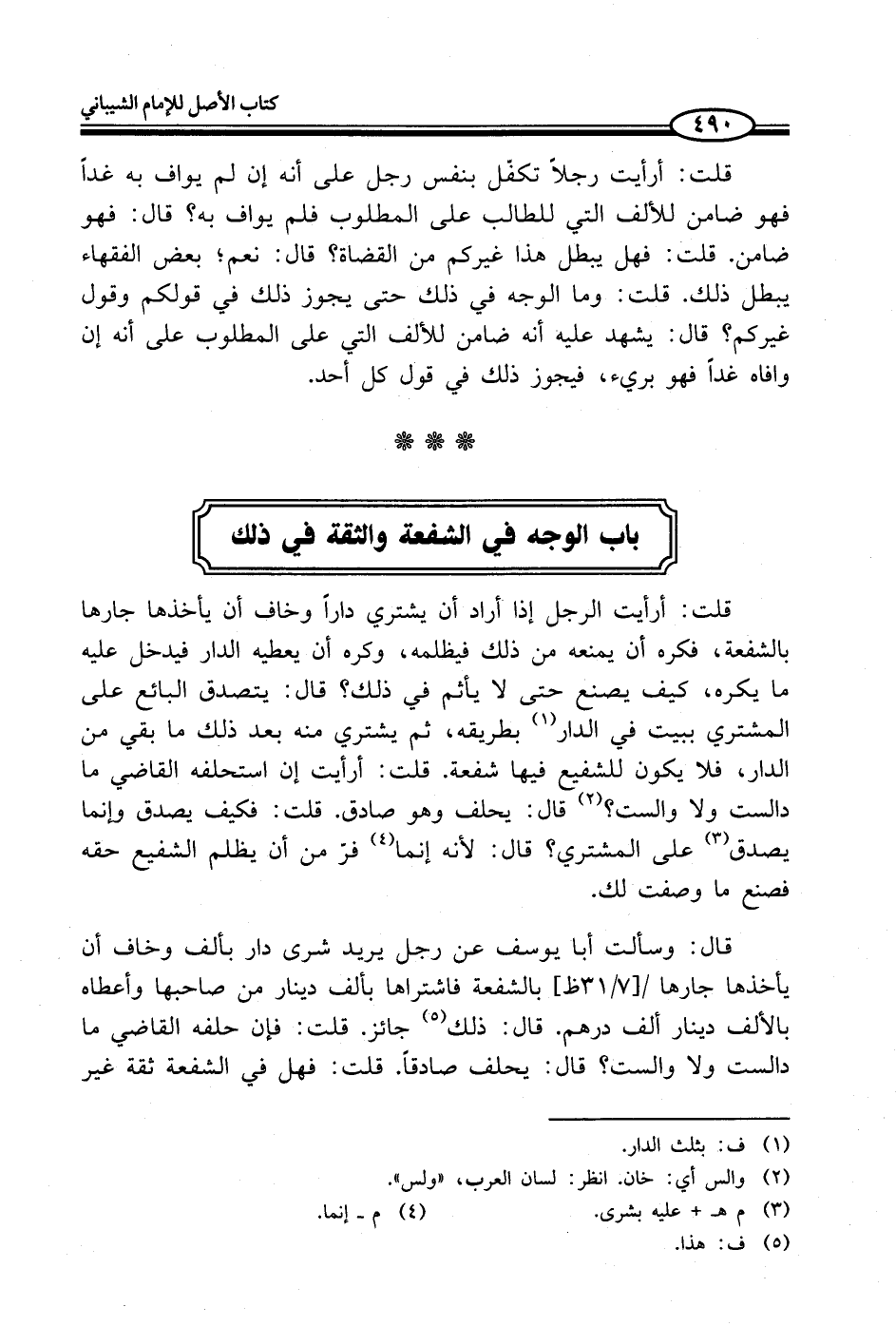 قال: وسألت أبا يوسف عن رجل يريد شرى دار بألف وخاف أن ياخذها جارها بالشفعة فاشتراها بألف دينار من صاحبها وأعطاه بالألف دينار ألف درهم. قال: ذلك (¬5) جائز. قلت: فإن حلفه القاضي ما دالست ولا والست؟ قال: يحلف صادقاً. قلت: فهل في الشفعة ثقه غير