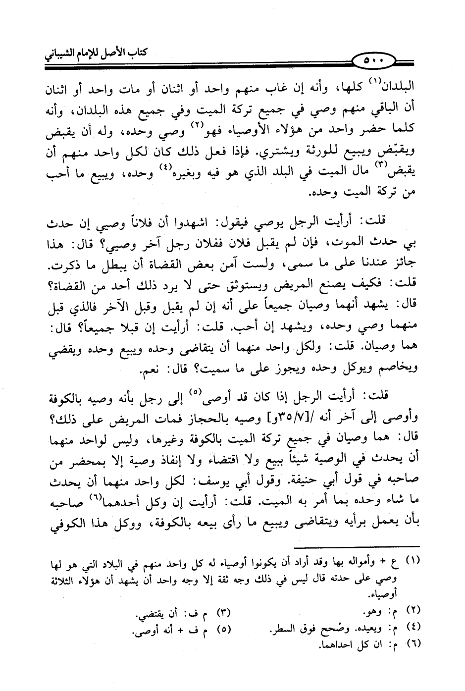 قلت: أرأيت الرجل إذا كان قد أوصى (¬5) إلى رجل بأنه وصيه بالكوفة وأوصى إلى آخر أنه وصيه بالحجاز فمات المريض على ذلك؟ قال: هما وصيان في جميعِ تركة الميت بالكوفة وغيرها، وليس لواحد منهما أن يحدث في الوصية شيئا ببيع ولا اقتضاء ولا إنفاذ وصية إلا بمحضر من صاحبه في قول أبي حنيفة. وقول أبي يوسف: لكل واحد منهما أن يحدث ما شاء وحده بما أمر به الميت. قلت: أرأيت إن وكل أحدهما (¬6) صاحبه بان يعمل برأيه ويتقاضى ويبيع ما رأى بيعه بالكوفة، ووكل هذا الكوفي