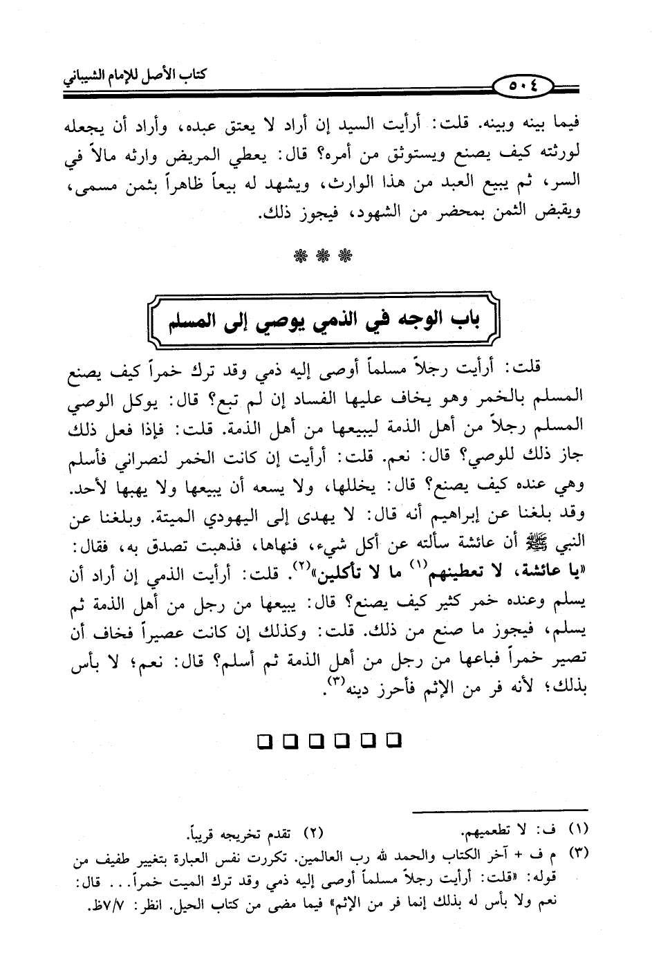 (¬3) م ف + آخر الكتاب والحمد لله رب العالمين. تكررت نفس العبارة بتغيير طفيف من قوله: "قلت: أرأيت رجلاً مسلماً أوصى إليه ذمي وقد ترك الميت خمراً ... قال: نعم ولا بأس له بذلك إنما فر من الإثم" فيما مضى من كتاب الحيل. انظر: 7/ 7 ظ.