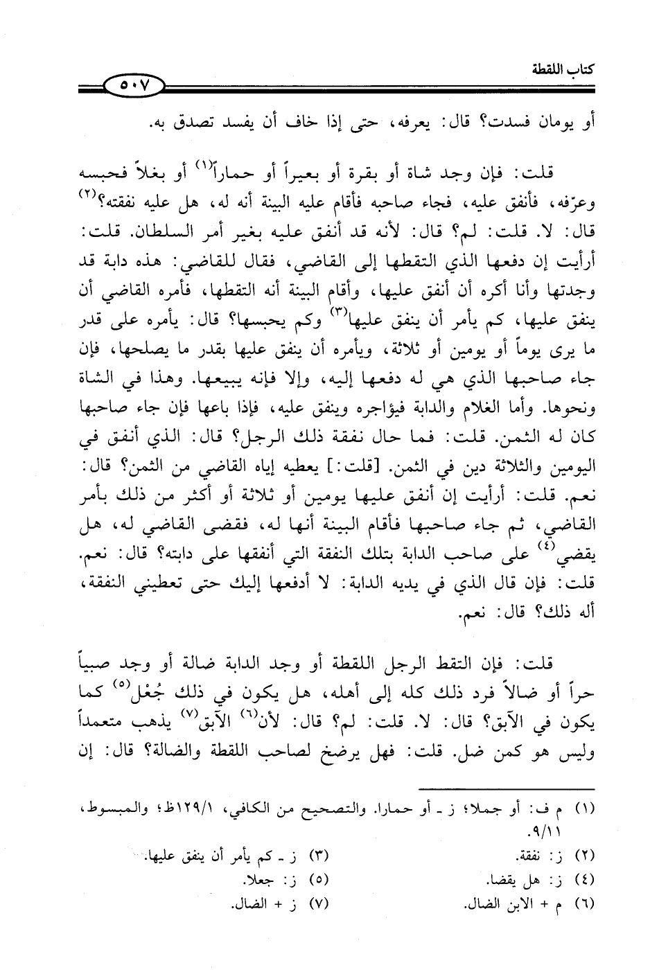 قلت: فإن وجد شاة أو بقرة أو بعيراً أو حماراً (¬1) أو بغلاً فحبسه وعرّفه، فأنفق عليه، فجاء صاحبه فأقام عليه البينة أنه له، هل عليه نفقته؟ (¬2) قال: لا. قلت: لم؟ قال: لأنه قد أنفق عليه بغير أمر السلطان. قلت: أرأيت إن دفعها الذي التقطها إلى القاضي، فقال للقاضي: هذه دابة قد وجدتها وأنا أكره أن أنفق عليها، وأقام البينة أنه التقطها، فأمره القاضي أن ينفق عليها، كم يأمر أن ينفق عليها (¬3) وكم يحبسها؟ قال: يأمره على قدر ما يرى يوماً أو يومين أو ثلاثة، ويأمره أن ينفق عليها بقدر ما يصلحها، فإن جاء صاحبها الذي هي له دفعها إليه، وإلا فإنه يبيعها. وهذا في الشاة ونحوها. وأما الغلام والدابة فيؤاجره وينفق عليه، فإذا باعها فإن جاء صاحبها كان له الثمن. قلت: فما حال نفقة ذلك الرجل؟ قال: الذي أنفق في اليومين والثلاثة دين في الثمن. [قلت:] يعطيه إياه القاضي من الثمن؟ قال: نعم. قلت: أرأيت إن أنفق عليها يومين أو ثلاثة أو أكثر من ذلك بأمر القاضي، ثم جاء صاحبها فأقام البينة أنها له، فقضى القاضي له، هل يقضي (¬4) على صاحب الدابة بتلك النفقة التي أنفقها على دابته؟ قال: نعم. قلت: فإن قال الذي في يديه الدابة: لا أدفعها إليك حتى تعطيني النفقة، أله ذلك؟ قال: نعم.