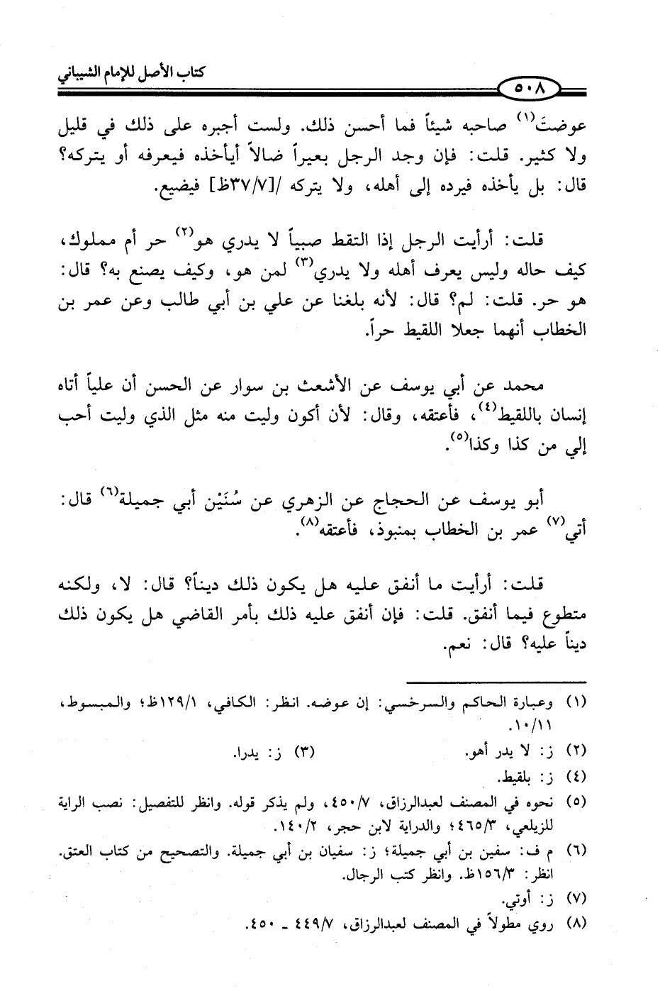 أبو يوسف عن الحجاج عن الزهري عن سُنَيْن أبي جميلة (¬6) قال: أتي (¬7) عمر بن الخطاب بمنبوذ، فأعتقه (¬8).
