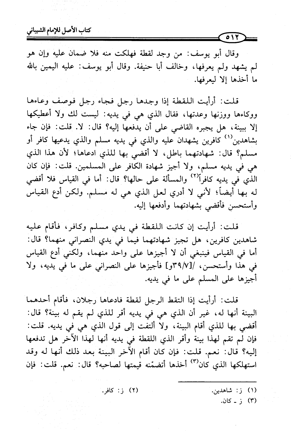 قلت: أرأيت إن كانت اللقطة في يدي مسلم وكافر، فأقام عليه شاهدين كافرين، هل تجيز شهادتهما فيما في يدي النصراني منهما؟ قال: أما في القياس فينبغي أن لا أجيزها على واحد منهما، ولكني أدع القياس في هذا وأستحسن، فأجيزها على النصراني على ما في يديه، ولا أجيزها على المسلم على ما في يديه.