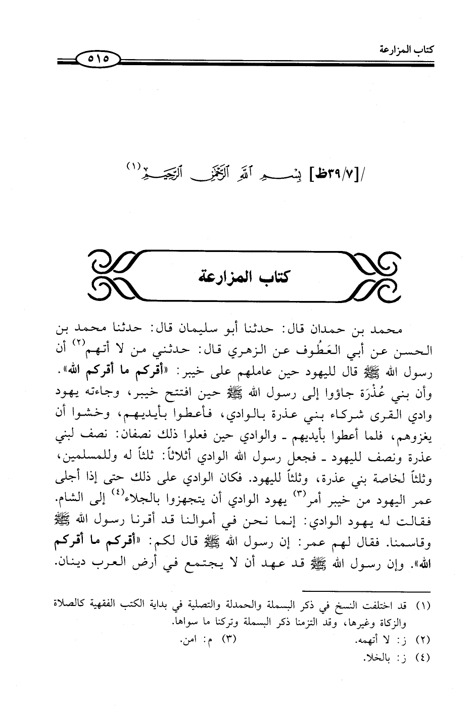 محمد بن حمدان قال: حدثنا أبو سليمان قال: حدثنا محمد بن الحسن عن أبي العَطُوف عن الزهري قال: حدثني من لا أتهم (¬2) أن رسول الله - صلى الله عليه وسلم - قال لليهود حين عاملهم على خيبر: "أقركم ما أقركم الله". وأن بني عُذْرَة جاؤوا إلى رسول الله - صلى الله عليه وسلم - حين افتتح خيبر، وجاءته يهود وادي القرى شركاء بني عذرة بالوادي، فأعطوا بأيديهم، وخشوا أن يغزوهم، فلما أعطوا بأيديهم - والوادي حين فعلوا ذلك نصفان: نصف لبني عذرة ونصف لليهود - فجعل رسول الله الوادي أثلاثاً: ثلثاً له وللمسلمين، وثلثاً لخاصة بني عذرة، وثلثاً لليهود. فكان الوادي على ذلك حتى إذا أجلى عمر اليهود من خيبر أمر (¬3) يهود الوادي أن يتجهزوا بالجلاء (¬4) إلى الشام. فقالت له يهود الوادي: إنما نحن في أموالنا قد أقرنا رسول الله - صلى الله عليه وسلم - وقاسمنا. فقال لهم عمر: إن رسول الله - صلى الله عليه وسلم - قال لكم: "أقركم ما أقركم الله". وإن رسول الله - صلى الله عليه وسلم - قد عهد أن لا يجتمع في أرض العرب دينان.