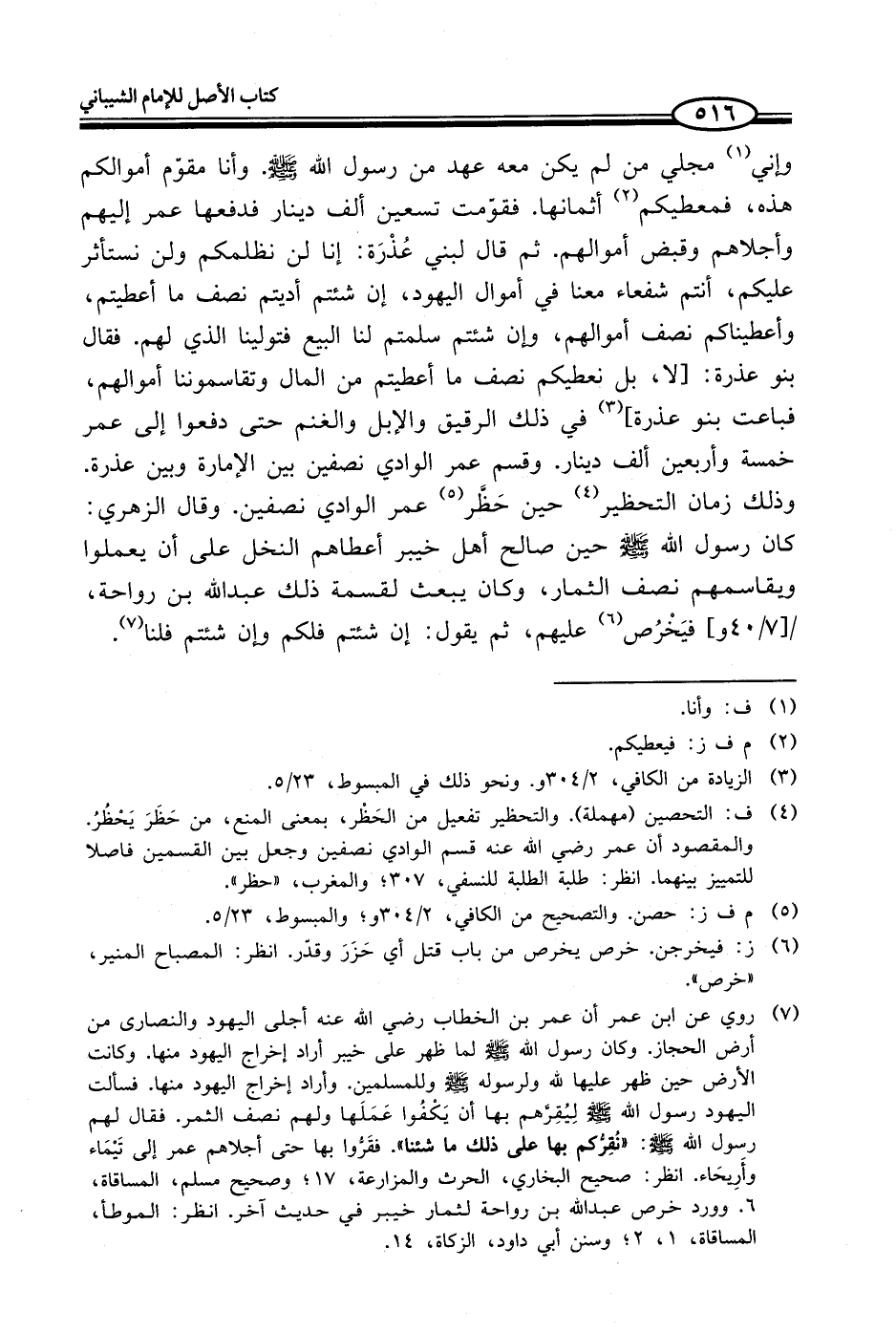 (¬7) روي عن ابن عمر أن عمر بن الخطاب - رضي الله عنه - أجلى اليهود والنصارى من أرض الحجاز. وكان رسول الله - صلى الله عليه وسلم - لما ظهر على خيبر أراد إخراج اليهود منها. وكانت الأرض حين ظهر عليها لله ولرسوله - صلى الله عليه وسلم - وللمسلمين. وأراد إخراج اليهود منها- فسألت اليهود رسول الله - صلى الله عليه وسلم - لِيُقِرهم بها أن يَكْفُوا عَمَلَها ولهم نصف الثمر. فقال لهم رسول الله - صلى الله عليه وسلم -: "نُقِركم بها على ذلك ما شئنا". فقَرُوا بها حتى أجلاهم عمر إلى تَيْمَاء وأَرِيحَاء. انظر: صحيح البخاري، الحرث والمزارعة، 17؛ وصحيح مسلم، المساقاة، 6. وورد خرص عبد الله بن رواحة لثمار خيبر في حديث آخر. انظر: الموطأ، المساقاة، 1، 2؛ وسنن أبي داود، الزكاة، 14.