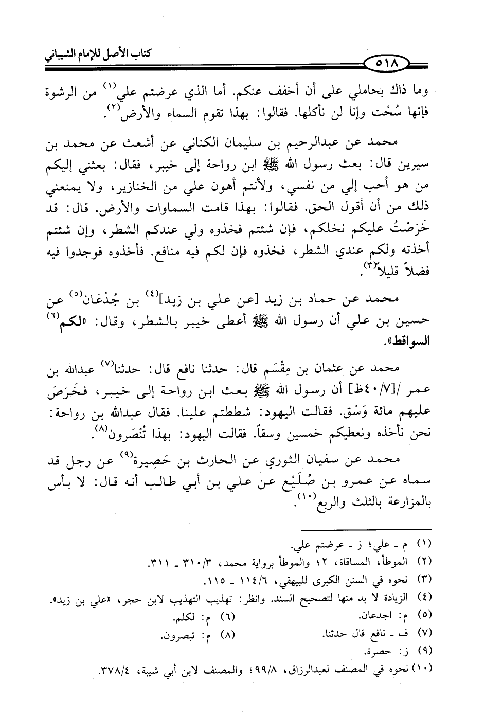 (¬2) الموطأ، المساقاة، 2؛ والموطأ برواية محمد، 3/ 310 - 311.