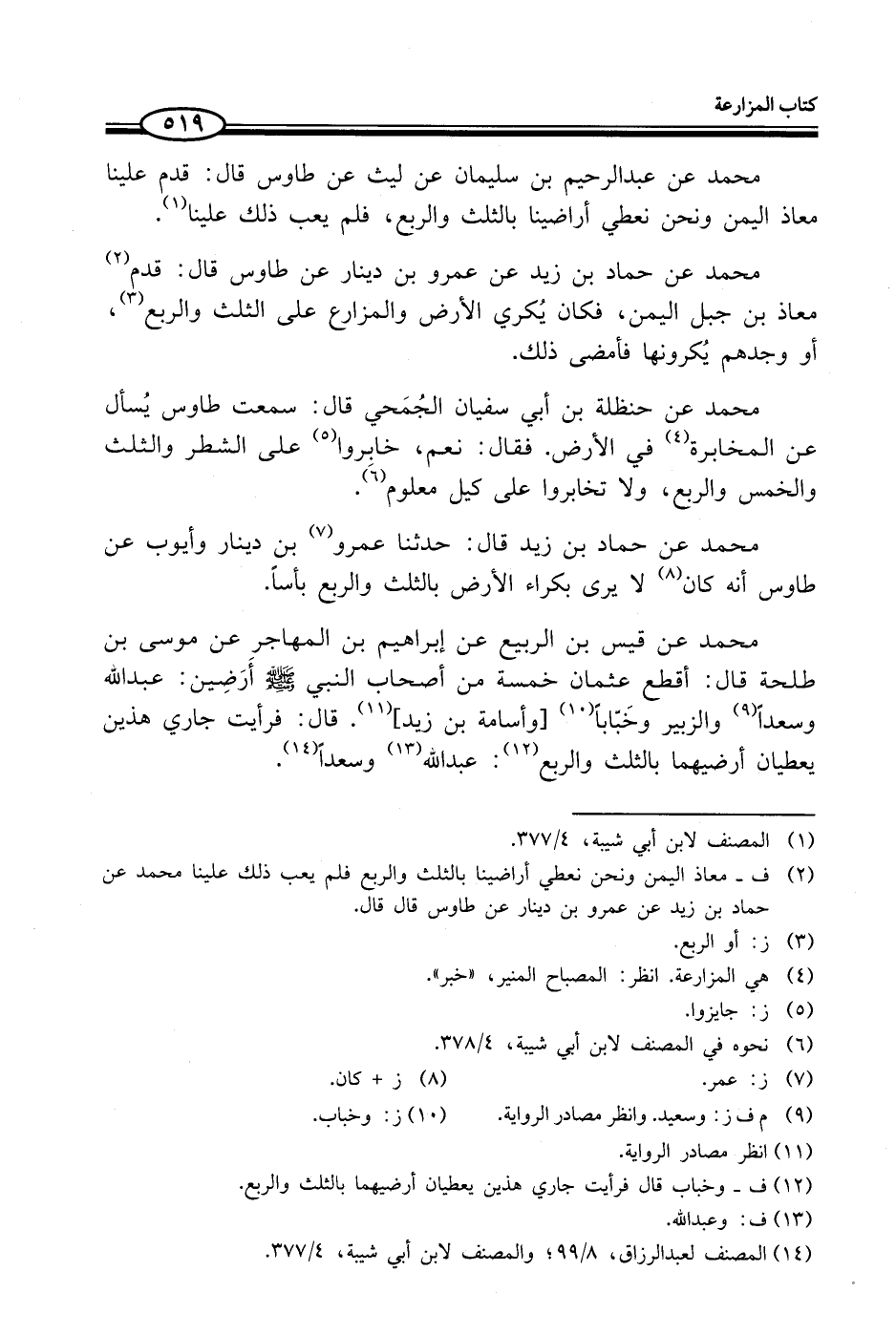 (¬2) ف - معاذ اليمن ونحن نعطي أراضينا بالثلث والربع فلم يعب ذلك علينا محمد عن حماد بن زيد عن عمرو بن دينار عن طاوس قال قال.