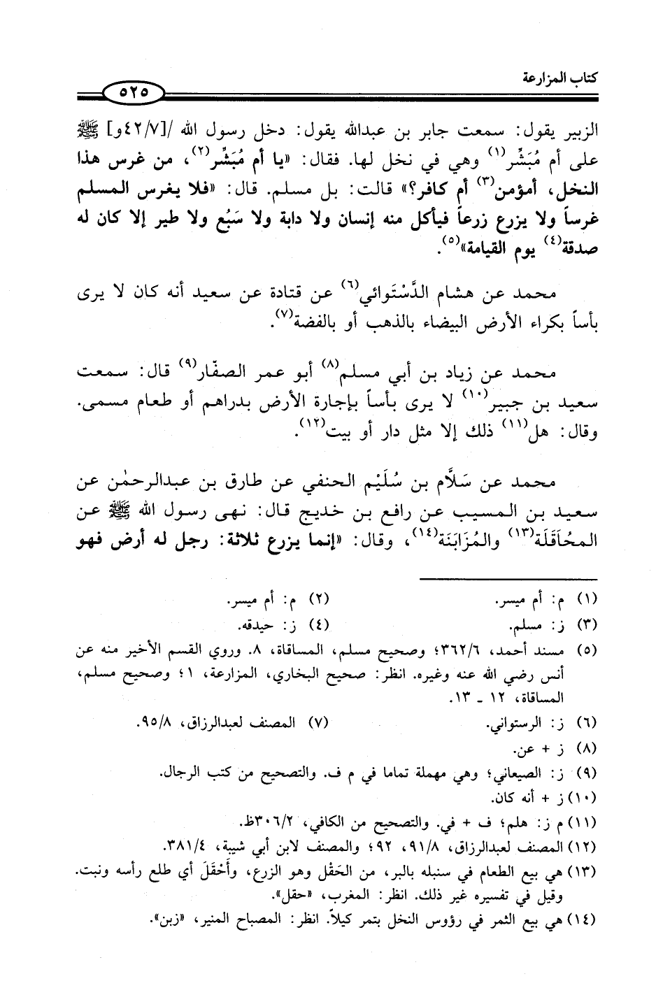 (¬5) مسند أحمد، 6/ 362؛ وصحيح مسلم، المساقاة، 8. وروي القسم الأخير منه عن أنس - رضي الله عنه - وغيره. انظر: صحيح البخاري، المزارعة، 1؛ وصحيح مسلم، المساقاة، 12 - 13.