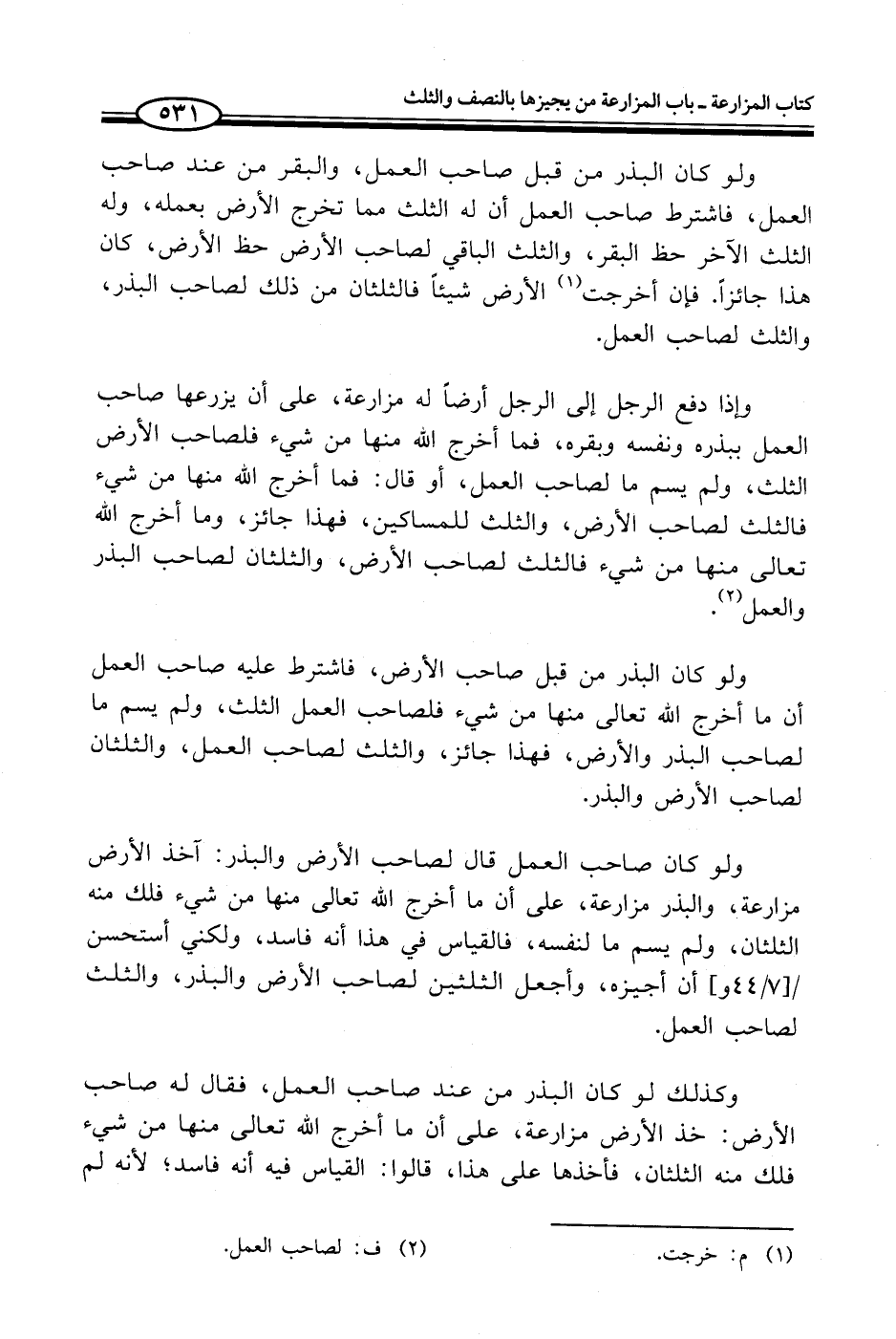 وإذا دفع الرجل إلى الرجل أرضاً له مزارعة، على أن يزرعها صاحب العمل ببذره ونفسه وبقره، فما أخرج الله منها من شيء فلصاحب الأرض الثلث، ولم يسم ما لصاحب العمل، أو قال: فما أخرج الله منها من شيء فالثلث لصاحب الأرض، والثلث للمساكين، فهذا جائز، وما أخرج الله تعالى منها من شيء فالثلث لصاحب الأرض، والثلثان لصاحب البذر والعمل (¬2).