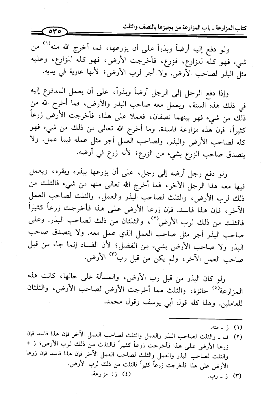 ولو كان البذر من قبل رب الأرض، والمسألة على حالها، كانت هذه المزارعة (¬4) جائزة، والثلث مما أخرجت الأرض لصاحب الأرض، والثلثان للعاملين. وهذا كله قول أبي يوسف وقول محمد.