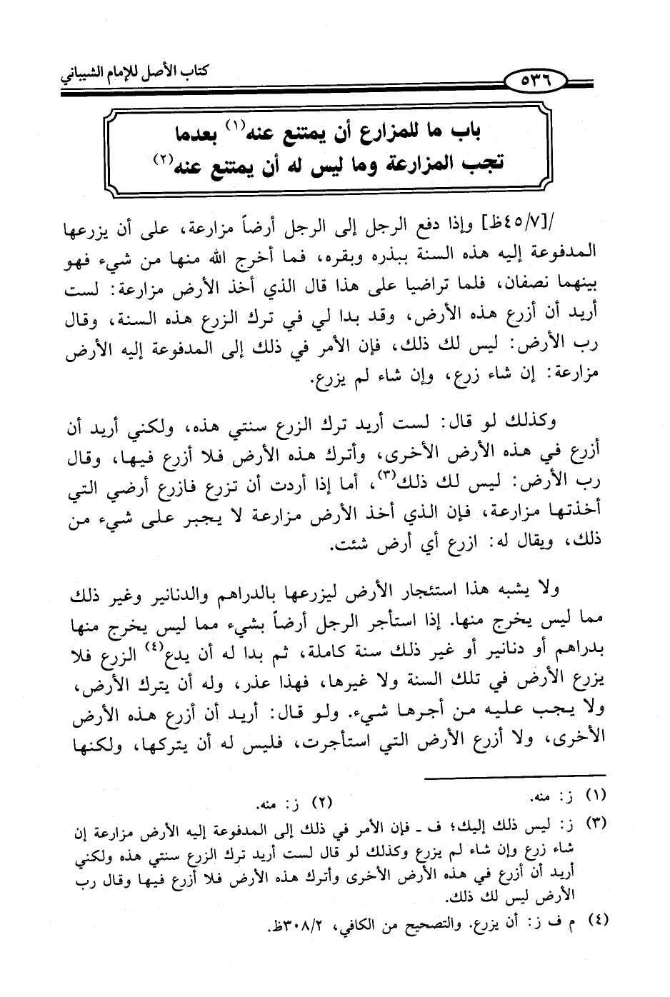 (¬3) ز: ليس ذلك إليك؛ ف - فإن الأمر في ذلك إلى المدفوعة إليه الأرض مزارعة إن شاء زرع وإن شاء لم يزرع وكذلك لو قال لست أريد ترك الزرع سنتي هذه ولكني أريد أن أزرع في هذه الأرض الأخرى وأترك هذه الأرض فلا أزرع فيها وقال رب الأرض ليس لك ذلك.