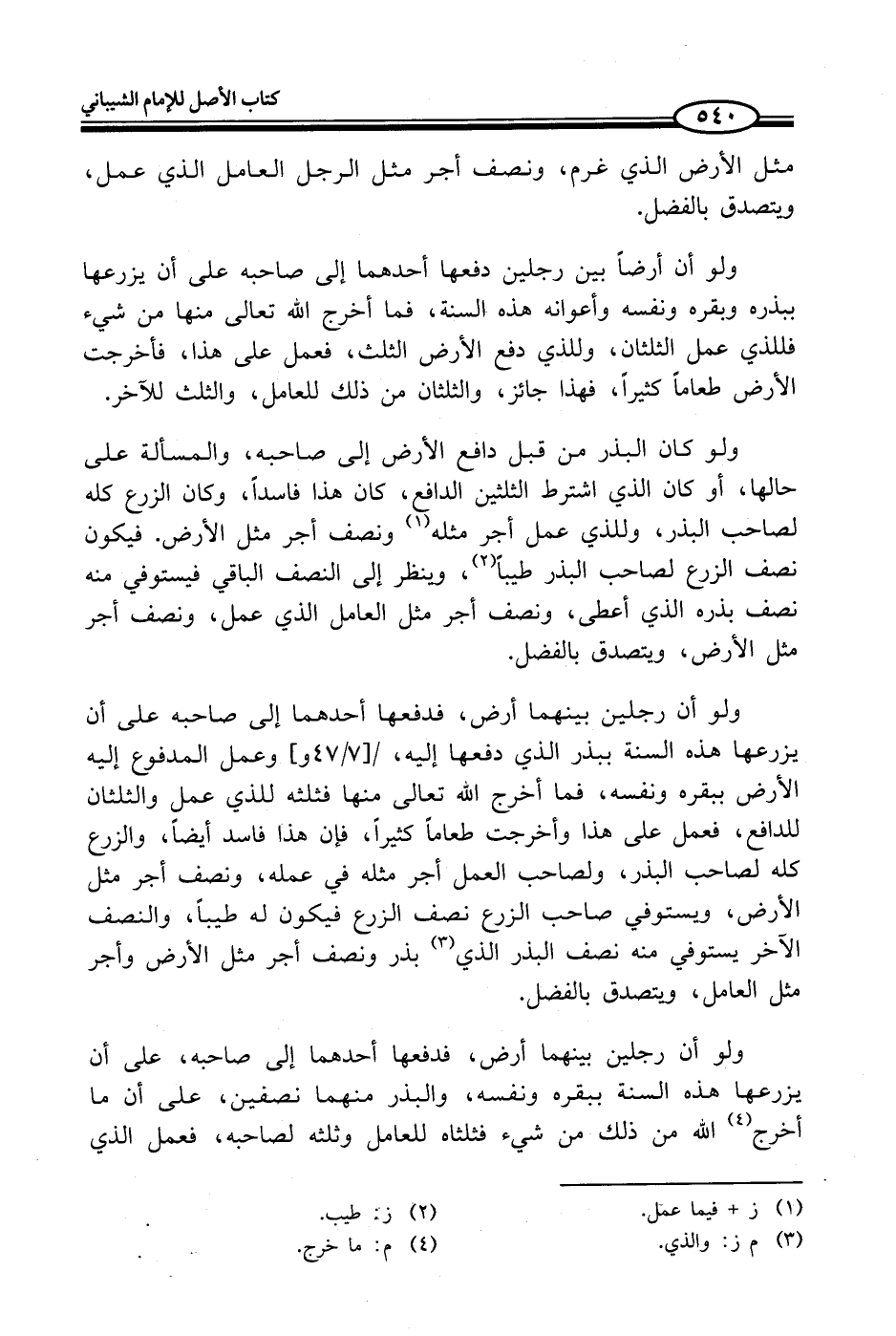 ولو كان البذر من قبل دافع الأرض إلى صاحبه، والمسألة على حالها، أو كان الذي اشترط الثلثين الدافع، كان هذا فاسداً، وكان الزرع كله لصاحب البذر، وللذي عمل أجر مثله (¬1) ونصف أجر مثل الأرض. فيكون نصف الزرع لصاحب البذر طيباً (¬2)، وينظر إلى النصف الباقي فيستوفي منه نصف بذره الذي أعطى، ونصف أجر مثل العامل الذي عمل، ونصف أجر مثل الأرض، ويتصدق بالفضل.