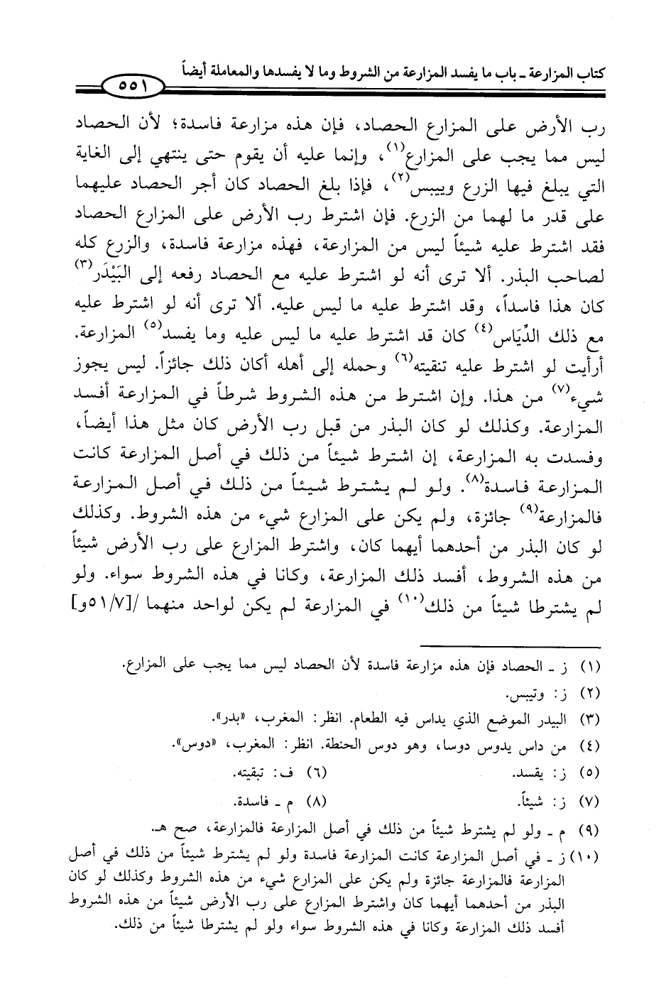 (¬10) ز - في أصل المزارعة كانت المزارعة فاسدة ولو لم يشترط شيئاً من ذلك في أصل المزارعة فالمزارعة جائزة ولم يكن على المزارع شيء من هذه الشروط وكذلك لو كان البذر من أحدهما أيهما كان واشترط المزارع على رب الأرض شيئاً من هذه الشروط أفسد ذلك المزارعة وكانا في هذه الشروط سواء ولو لم يشترطا شيئاً من ذلك.