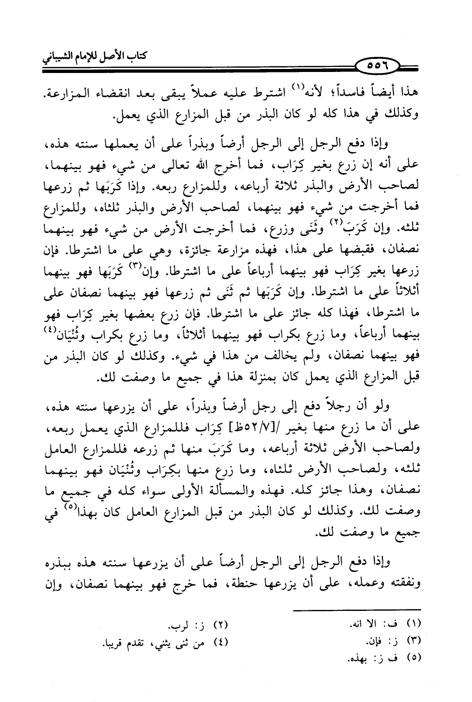 ولو أن رجلاً دفع إلى رجل أرضاً وبذراً، على أن يزرعها سنته هذه، على أن ما زرع منها بغير كِرَاب فللمزارع الذي يعمل ربعه، ولصاحب الأرض ثلاثة أرباعه، وما كَرَبَ منها ثم زرعه فللمزارع العامل ثلثه، ولصاحب الأرض ثلثاه، وما زرع منها بكِرَاب وثُنْيَان فهو بينهما نصفان، وهذا جائز كله. فهذه والمسألة الأولى سواء كله في جميع ما وصفت لك. وكذلك لو كان البذر من قبل المزارع العامل كان بهذا (¬5) في جميع ما وصفت لك.