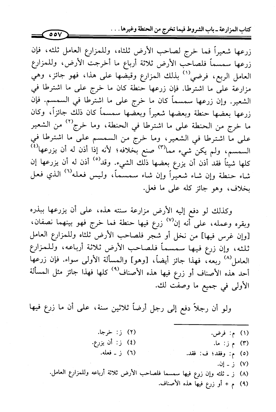 (¬8) ز - ثلثه وإن زرع فيها سمسما فلصاحب الأرض ثلاثة أرباعه وللمزارع العامل.