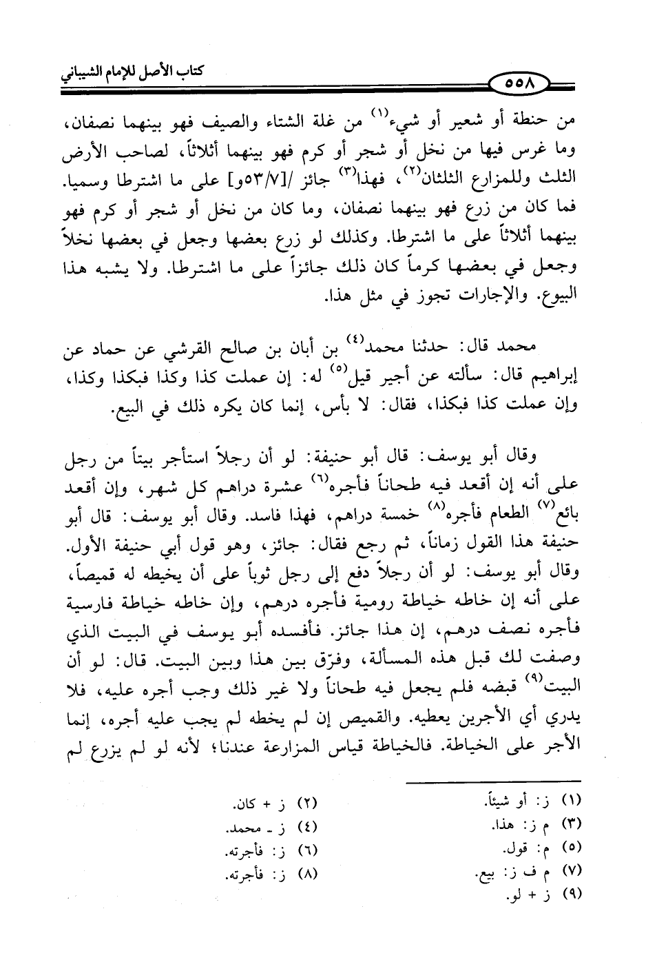 وقال أبو يوسف: قال أبو حنيفة: لو أن رجلاً استأجر بيتاً من رجل على أنه إن أقعد فيه طحاناً فأجره (¬6) عشرة دراهم كل شهر، وإن أقعد بائع (¬7) الطعام فأجره (¬8) خمسة دراهم، فهذا فاسد. وقال أبو يوسف: قال أبو حنيفة هذا القول زماناً، ثم رجع فقال: جائز، وهو قول أبي حنيفة الأول. وقال أبو يوسف: لو أن رجلاً دفع إلى رجل ثوباً على أن يخيطه له قميصاً، على أنه إن خاطه خياطة رومية فأجره درهم، وإن خاطه خياطة فارسية فأجره نصف درهم، إن هذا جائز. فأفسده أبو يوسف في البيت الذي وصفت لك قبل هذه المسألة، وفرّق بين هذا وبين البيت. قال: لو أن البيت (¬9) قبضه فلم يجعل فيه طحاناً ولا غير ذلك وجب أجره عليه، فلا يدري أي الأجرين يعطيه. والقميص إن لم يخطه لم يجب عليه أجره، إنما الأجر على الخياطة. فالخياطة قياس المزارعة عندنا؛ لأنه لو لم يزرع لم