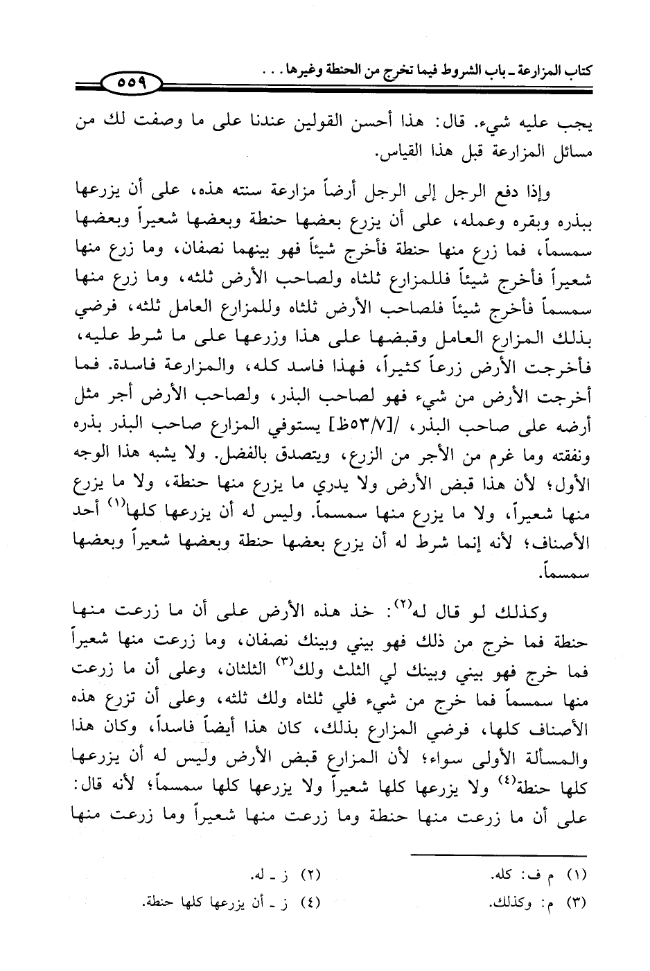 وكذلك لو قال له (¬2): خذ هذه الأرض على أن ما زرعت منها حنطة فما خرج من ذلك فهو بيني وبينك نصفان، وما زرعت منها شعيراً فما خرج فهو بيني وبينك لي الثلث ولك (¬3) الثلثان، وعلى أن ما زرعت منها سمسماً فما خرج من شيء فلي ثلثاه ولك ثلثه، وعلى أن تزرع هذه الأصناف كلها، فرضي المزارع بذلك، كان هذا أيضاً فاسداً، وكان هذا والمسألة الأولى سواء؛ لأن المزارع قبض الأرض وليس له أن يزرعها كلها حنطة (¬4) ولا يزرعها كلها شعيراً ولا يزرعها كلها سمسماً؛ لأنه قال: على أن ما زرعت منها حنطة وما زرعت منها شعيراً وما زرعت منها