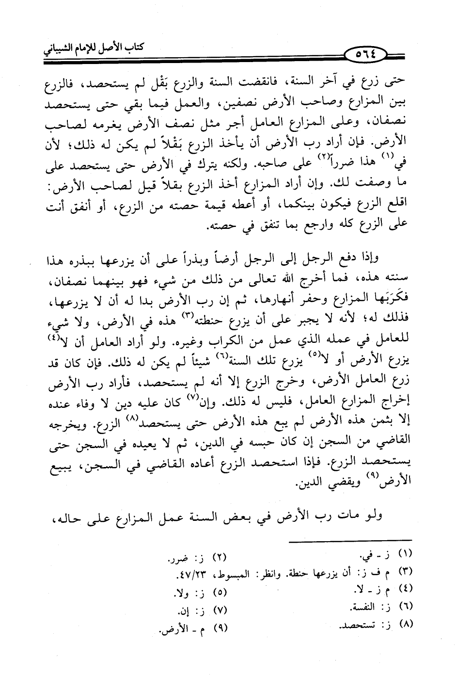 وإذا دفع الرجل إلى الرجل أرضاً وبذراً على أن يزرعها ببذره هذا سنته هذه، فما أخرج الله تعالى من ذلك من شيء فهو بينهما نصفان، فكَرَبَها المزارع وحفر أنهارها، ثم إن رب الأرض بدا له أن لا يزرعها، فذلك له؛ لأنه لا يجبر على أن يزرع حنطته (¬3) هذه في الأرض، ولا شيء للعامل في عمله الذي عمل من الكراب وغيره. ولو أراد العامل أن لا (¬4) يزرع الأرض أو لا (¬5) يزرع تلك السنة (¬6) شيئاً لم يكن له ذلك. فإن كان قد زرع العامل الأرض، وخرج الزرع إلا أنه لم يستحصد، فأراد رب الأرض إخراج المزارع العامل، فليس له ذلك. وإن (¬7) كان عليه دين لا وفاء عنده إلا بثمن هذه الأرض لم يبع هذه الأرض حتى يستحصد (¬8) الزرع. ويخرجه القاضي من السجن إن كان حبسه في الدين، ثم لا يعيده في السجن حتى يستحصد الزرع. فإذا استحصد الزرع أعاده القاضي في السجن، يبيع الأرض (¬9) ويقضي الدين.