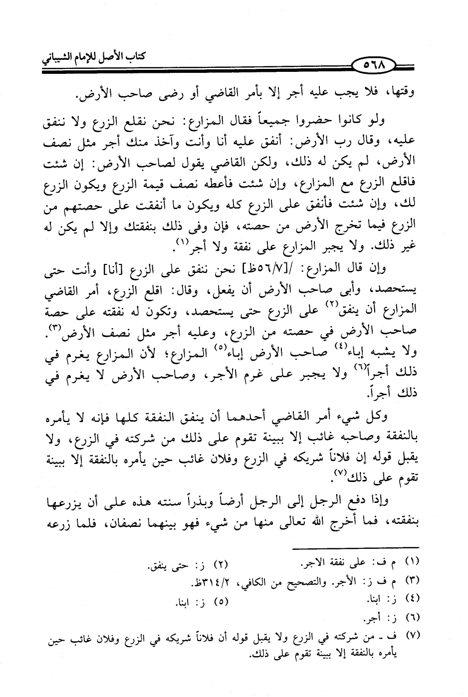 (¬7) ف - من شركته في الزرع ولا يقبل قوله أن فلاناً شريكه في الزرع وفلان غائب حين يأمره بالنفقة إلا ببينة تقوم على ذلك.