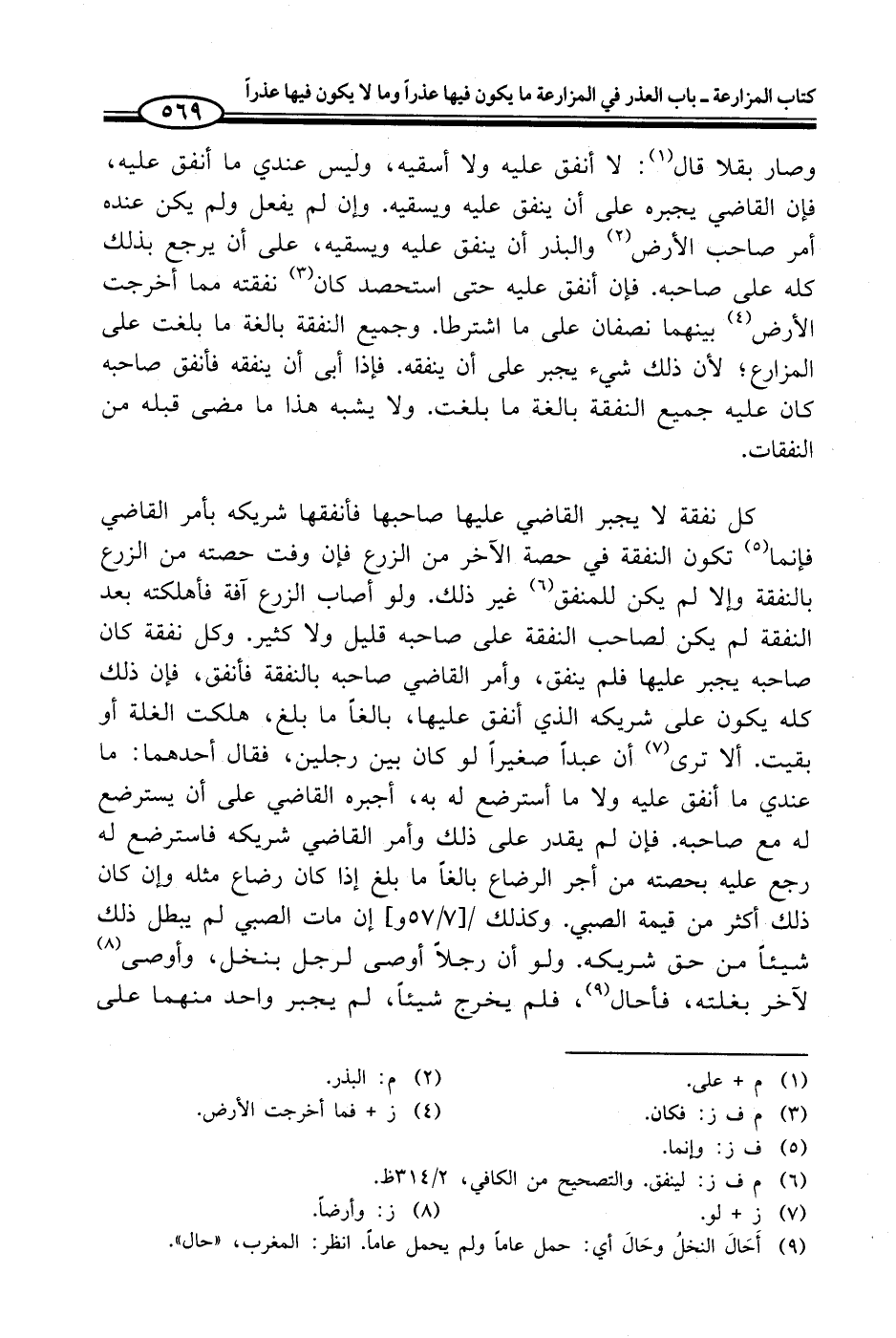 كل نفقة لا يجبر القاضي عليها صاحبها فأنفقها شريكه بأمر القاضي فإنما (¬5) تكون النفقة في حصة الآخر من الزرع فإن وفت حصته من الزرع بالنفقة وإلا لم يكن للمنفق (¬6) غير ذلك. ولو أصاب الزرع آفة فأهلكته بعد النفقة لم يكن لصاحب النفقة على صاحبه قليل ولا كثير. وكل نفقة كان صاحبه يجبر عليها فلم ينفق، وأمر القاضي صاحبه بالنفقة فأنفق، فإن ذلك كله يكون على شريكه الذي أنفق عليها، بالغاً ما بلغ، هلكت الغلة أو بقيت. ألا ترى (¬7) أن عبداً صغيراً لو كان بين رجلين، فقال أحدهما: ما عندي ما أنفق عليه ولا ما أسترضع له به، أجبره القاضي على أن يسترضع له مع صاحبه. فإن لم يقدر على ذلك وأمر القاضي شريكه فاسترضع له رجع عليه بحصته من أجر الرضاع بالغاً ما بلغ إذا كان رضاع مثله وإن كان ذلك أكثر من قيمة الصبي. وكذلك إن مات الصبي لم يبطل ذلك شيئاً من حق شريكه. ولو أن رجلاً أوصى لرجل بنخل، وأوصى (¬8) لآخر بغلته، فأحال (¬9)، فلم يخرج شيئاً، لم يجبر واحد منهما على