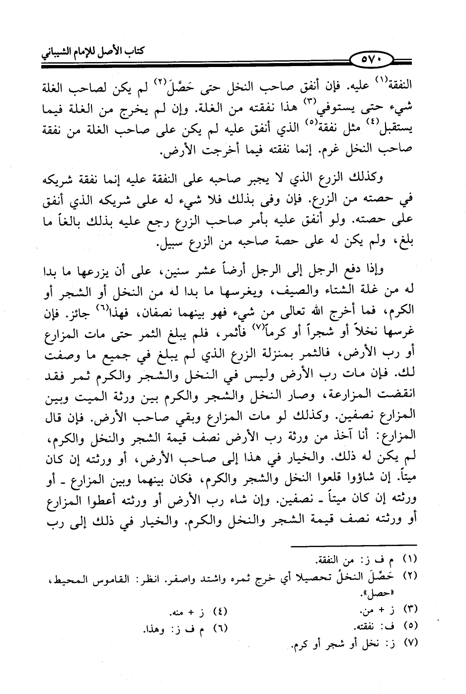 وإذا دفع الرجل إلى الرجل أرضاً عشر سنين، على أن يزرعها ما بدا له من غلة الشتاء والصيف، ويغرسها ما بدا له من النخل أو الشجر أو الكرم، فما أخرج الله تعالى من شيء فهو بينهما نصفان، فهذا (¬6) جائز. فإن غرسها نخلاً أو شجراً أو كرماً (¬7) فأثمر، فلم يبلغ الثمر حتى مات المزارع أو رب الأرض، فالثمر بمنزلة الزرع الذي لم يبلغ في جميع ما وصفت لك. فإن مات رب الأرض وليس في النخل والشجر والكرم ثمر فقد انقضت المزارعة، وصار النخل والشجر والكرم بين ورثة الميت وبين المزارع نصفين. وكذلك لو مات المزارع وبقي صاحب الأرض. فإن قال المزارع: أنا آخذ من ورثة رب الأرض نصف قيمة الشجر والنخل والكرم، لم يكن له ذلك. والخيار في هذا إلى صاحب الأرض، أو ورثته إن كان ميتاَ. إن شاؤوا قلعوا النخل والشجر والكرم، فكان بينهما وبين المزارع - أو ورثته إن كان ميتاً - نصفين. وإن شاء رب الأرض أو ورثته أعطوا المزارع أو ورثته نصف قيمة الشجر والنخل والكرم. والخيار في ذلك إلى رب