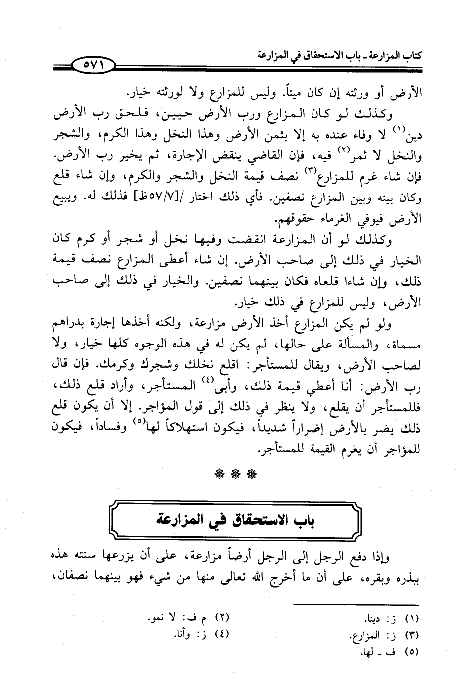 ولو لم يكن المزارع أخذ الأرض مزارعة، ولكنه أخذها إجارة بدراهم مسماة، والمسألة على حالها، لم يكن له في هذه الوجوه كلها خيار، ولا لصاحب الأرض، ويقال للمستأجر: اقلع نخلك وشجرك وكرمك. فإن قال رب الأرض: أنا أعطي قيمة ذلك، وأبى (¬4) المستأجر، وأراد قلع ذلك، فللمستأجر أن يقلع، ولا ينظر في ذلك إلى قول المؤاجر. إلا أن يكون قلع ذلك يضر بالأرض إضراراً شديداً، فيكون استهلاكاً لها (¬5) وفساداً، فيكون للمؤاجر أن يغرم القيمة للمستأجر.