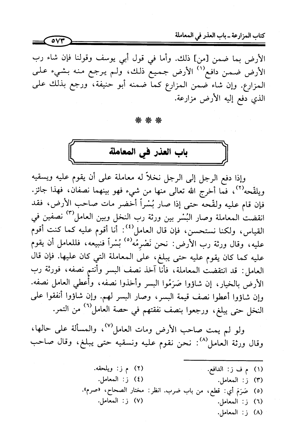 وإذا دفع الرجل إلى الرجل نخلاً له معاملة على أن يقوم عليه ويسقيه ويلقّحه (¬2)، فما أخرج الله تعالى منها من شيء فهو بينهما نصفان، فهذا جائز. فإن قام عليه ولقّحه حتى إذا صار بُسْراً أخضر مات صاحب الأرض، فقد انقضت المعاملة وصار البُسْر بين ورثة رب النخل وبين العامل (¬3) نصفين في القياس، ولكنا نستحسن، فإن قال العامل (¬4): أنا أقوم عليه كما كنت أقوم عليه، وقال ورثة رب الأرض: نحن نَصْرِمُه (¬5) بُسْراً فنبيعه، فللعامل أن يقوم عليه كما كان يقوم عليه حتى يبلغ، على المعاملة التي كان عليها. فإن قال العامل: قد انتقضت المعاملة، فأنا آخذ نصف البسر وأنتم نصفه، فورثة رب الأرض بالخيار، إن شاؤوا صَرَمُوا البسر وأخذوا نصفه، وأعطي العامل نصفه. وإن شاؤوا أعطوا نصف قيمة البسر، وصار البسر لهم. وإن شاؤوا أنفقوا على النخل حتى يبلغ، ورجعوا بنصف نفقتهم في حصة العامل (¬6) من التمر.