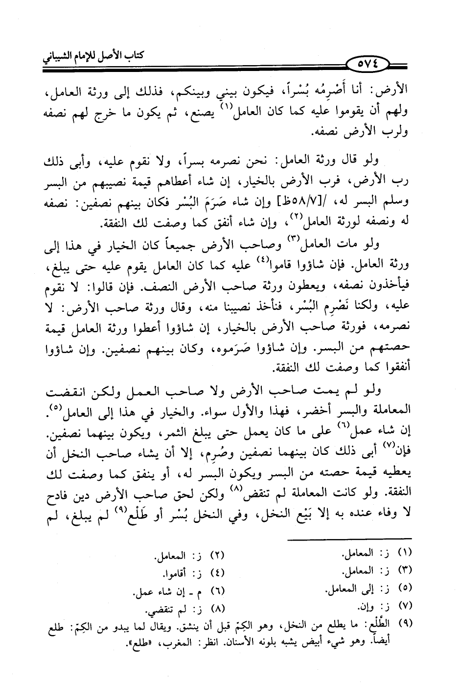 ولو مات العامل (¬3) وصاحب الأرض جميعاً كان الخيار في هذا إلى ورثة العامل. فإن شاؤوا قاموا (¬4) عليه كما كان العامل يقوم عليه حتى يبلغ، فيأخذون نصفه، ويعطون ورثة صاحب الأرض النصف. فإن قالوا: لا نقوم عليه، ولكنا نَصْرِم البُسْر، فنأخذ نصيبنا منه، وقال ورثة صاحب الأرض: لا نصرمه، فورثة صاحب الأرض بالخيار، إن شاؤوا أعطوا ورثة العامل قيمة حصتهم من البسر. وإن شاؤوا صَرَموه، وكان بينهم نصفين. وإن شاؤوا أنفقوا كما وصفت لك النفقة.