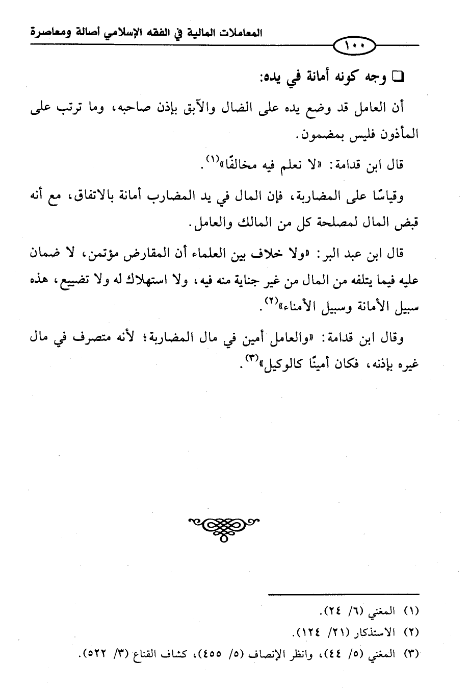 قال ابن عبد البر: "ولا خلاف بين العلماء أن المقارض مؤتمن، لا ضمان عليه فيما يتلفه من المال من غير جناية منه فيه، ولا استهلاك له ولا تضييع، هذه سبيل الأمانة وسبيل الأمناء" (¬٢).