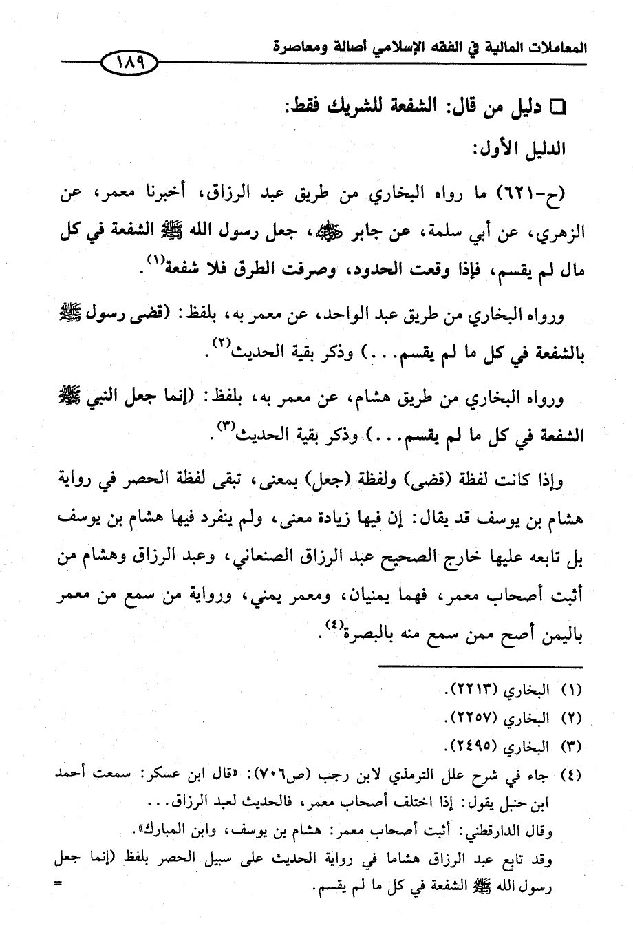 (ح-٦٢١) ما رواه البخاري من طريق عبد الرزاق، أخبرنا معمر، عن الزهري، عن أبي سلمة، عن جابر - رضي الله عنه -، جعل رسول الله - صلى الله عليه وسلم - الشفعة في كل مال لم يقسم، فإذا وقعت الحدود، وصرفت الطرق فلا شفعة (¬١).