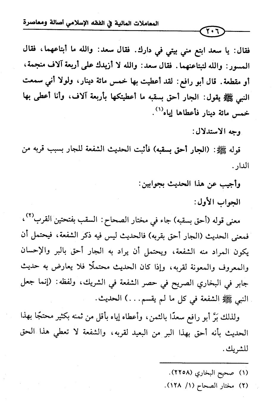 معنى قوله (أحق بسقبه) جاء في مختار الصحاح: السقب بفتحتين القرب (¬٢)، فمعنى الحديث (الجار أحق بقربه) فالحديث ليس فيه ذكر الشفعة، فيحتمل أن يكون المراد منه الشفعة، ويحتمل أن يراد به الجار أحق بالبر والإحسان والمعروف والمعونة لقربه، وإذا كان الحديث محتملًا فلا يعارض به حديث جابر في البخاري الصريح في حصر الشفعة في الشريك، ولفظه: (إنما جعل النبي - صلى الله عليه وسلم - الشفعة في كل ما لم يقسم ... ) الحديث.